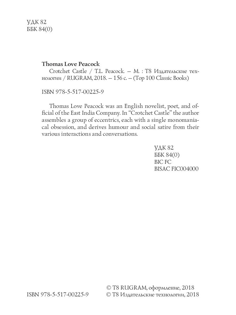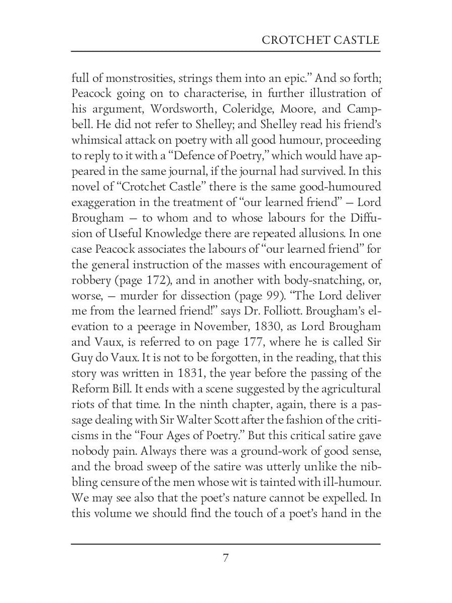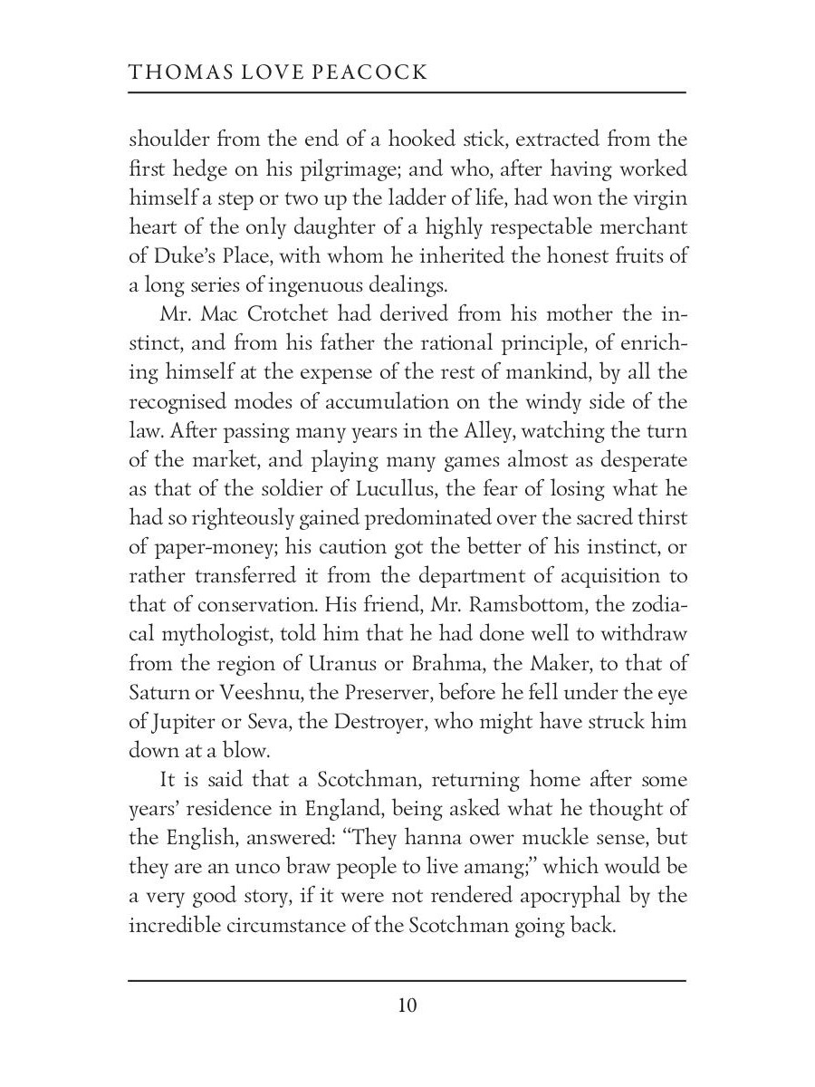 Thomas Love Peacock was an English novelist, poet, and official of the East India Company. In "Crotchet Castle" the author assembles a group of eccentrics, each with a single monomaniacal obsession, and derives humour and social satire from their various interactions and conversations.