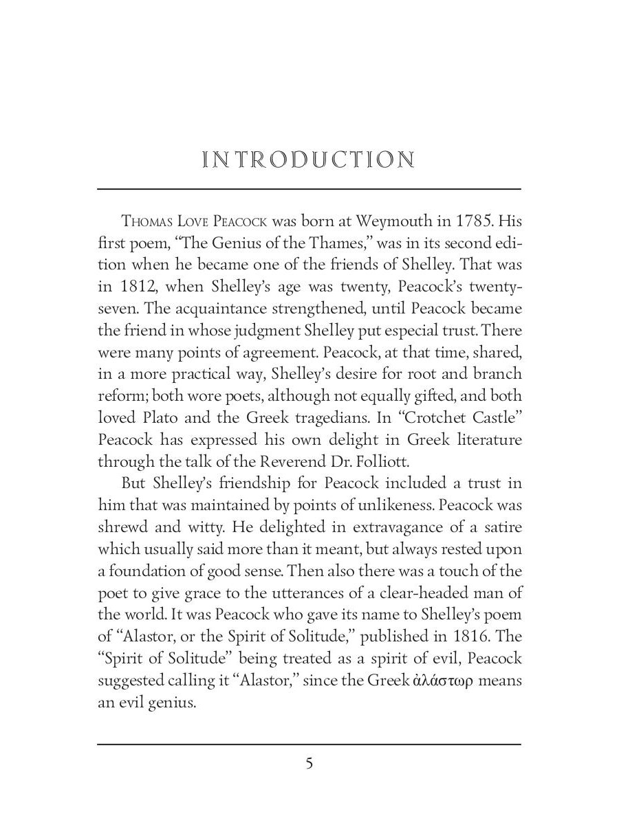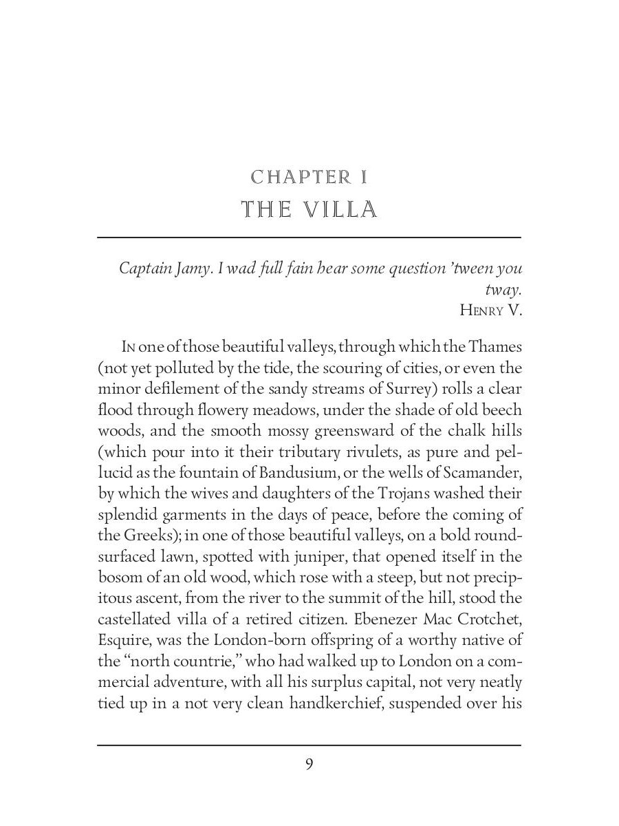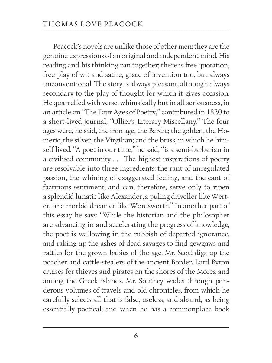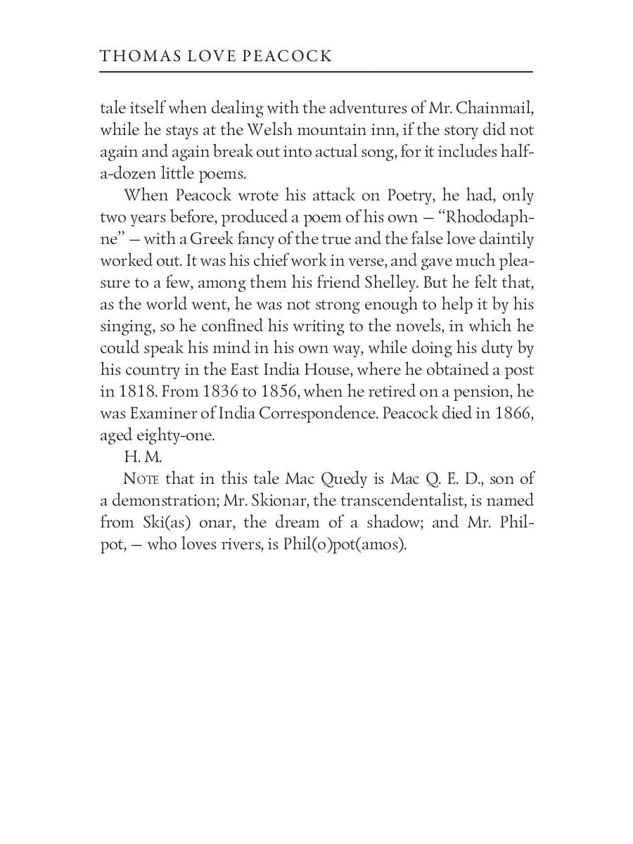 Thomas Love Peacock was an English novelist, poet, and official of the East India Company. In "Crotchet Castle" the author assembles a group of eccentrics, each with a single monomaniacal obsession, and derives humour and social satire from their various interactions and conversations.