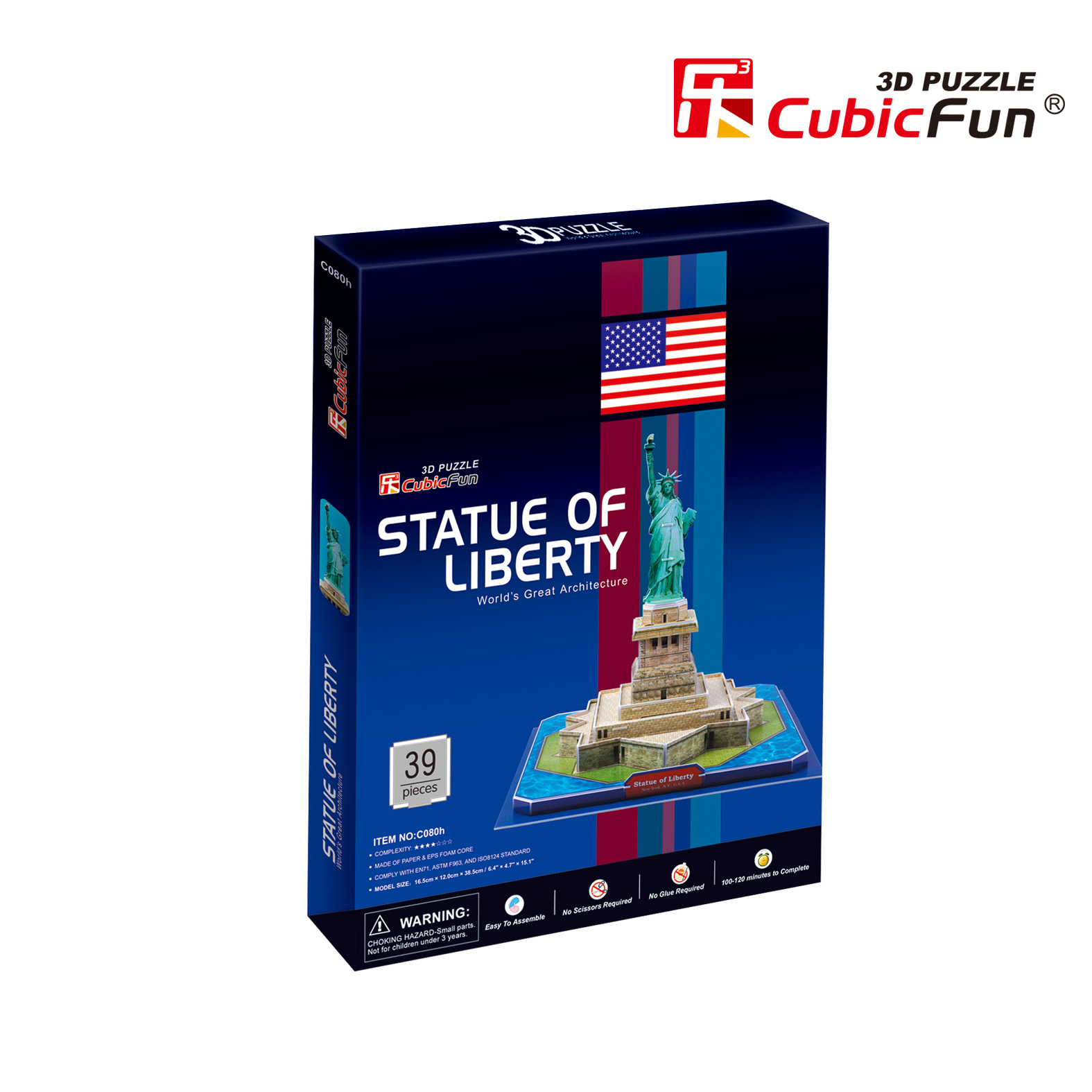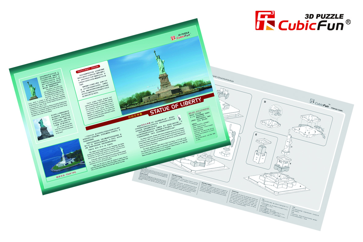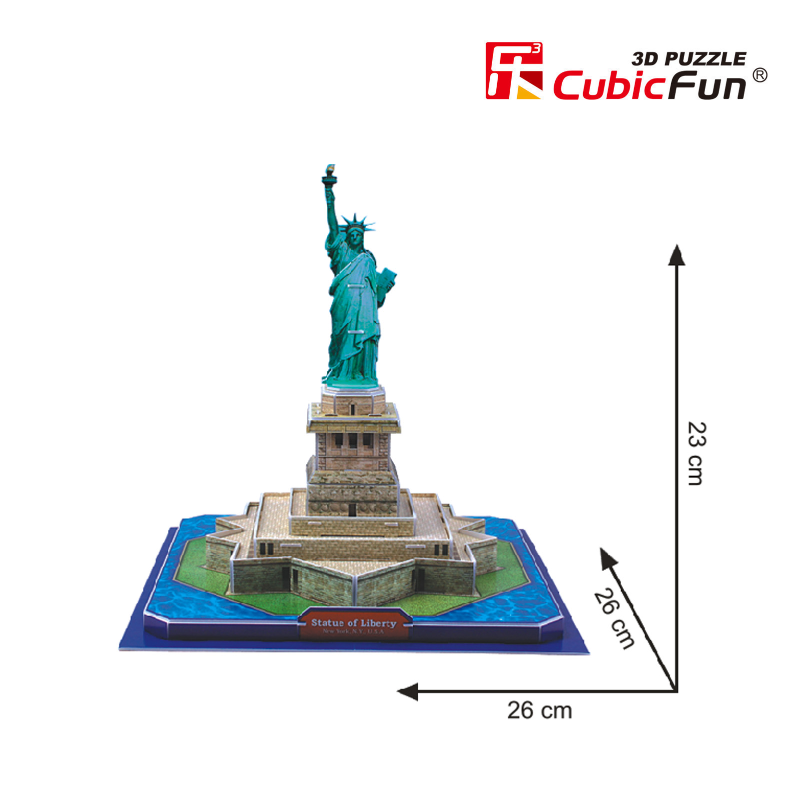 Все любят собирать пазлы - это весело и познавательно. Пазлы идеально подходят для собирания в одиночку или в группе. CubicFun - объемный пазл, конструктор-головоломка, разработан и сделан из бумаги и пены EPS, не требует дополнительных инструментов и клея для сборки. Наши конструкторы представляют определенный интерес не только для детей, но и для их родителей. Собранные объемные конструкторы-головоломки выглядят, совсем как настоящие, и с исторической точностью повторяют каждую деталь внешнего вида сооружения. Мы тщательно отбираем архитектурные шедевры для наших серий, чтобы Ваши дети могли ознакомиться с наиболее важными из них. Как известно дети редко желают усидчиво обучаться и качественно воспринимать и запоминать информацию, а в случае с конструкторами Cubic Fun это происходит само собой в развлекательно-познавательной форме. Ста́туя Свобо́ды (англ. Statue of Liberty, полное название - «Свобо́да, озаря́ющая мир», англ. Liberty Enlightening the World) - колоссальная скульптура в cтиле Наполеона III, или стиле Второй империи, расположенная в США на острове Свободы, находящемся в Верхней Нью-Йоркской бухте примерно в 3 километрах к юго-западу от южной оконечности острова Манхэттен. Была сооружена как подарок США от Франции ко Всемирной выставке 1876 года и столетию американской независимости (на выставке был показан только факел статуи). Завершённую статую США получили только в 1886 году. Является национальным памятником США и входит в список Всемирного наследия ЮНЕСКО. 28 октября 1886 года президент Гроувер Кливленд от имени американского народа принял преподнесенную в дар статую и сказал: «Мы всегда будем помнить, что Свобода избрала это место своим домом, и алтарь ее никогда не покроет забвение». Уровень сложности - 3. Размер готового пазла-модели: 26 x 26 x 26,2 см.