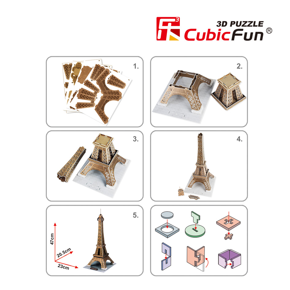 Все любят собирать пазлы - это весело и познавательно. Пазлы идеально подходят для собирания в одиночку или в группе. CubicFun - объемный пазл, конструктор-головоломка, разработан и сделан из бумаги и пены EPS, не требует дополнительных инструментов и клея для сборки. Наши конструкторы представляют определенный интерес не только для детей, но и для их родителей. Собранные объемные конструкторы-головоломки выглядят, совсем как настоящие, и с исторической точностью повторяют каждую деталь внешнего вида сооружения. Мы тщательно отбираем архитектурные шедевры для наших серий, чтобы Ваши дети могли ознакомиться с наиболее важными из них. Как известно дети редко желают усидчиво обучаться и качественно воспринимать и запоминать информацию, а в случае с конструкторами Cubic Fun это происходит само собой в развлекательно-познавательной форме. Эйфелева Башня (Париж) является самой узнаваемой архитектурной достопримечательностью Парижа, имеет мировую известность как символ Франции. Названа в честь своего конструктора Густава Эйфеля. Уровень сложности - 3. Размер готового пазла-модели: 23 x 20,5 x 47 см.