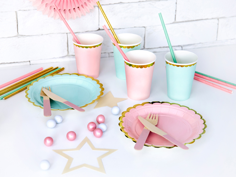 Paper Cups, mint with gold metallic edges, for cold drinks only, hold up to 220 ml (7.4 oz). Beverage cups bear the printed marking required by Commission Implementing Regulation (EU) 2020/2151 of 17 December 2020 laying down rules on harmonised marking specifications on single-use plastic products listed in Part D of the Annex to Directive (EU) 2019/904 of the European Parliament and of the Council on the reduction of the impact of certain plastic products on the environment. The product is labelled only in Polish, English, Maltese, Swedish, Finnish, Danish, Italian and Lithuanian.