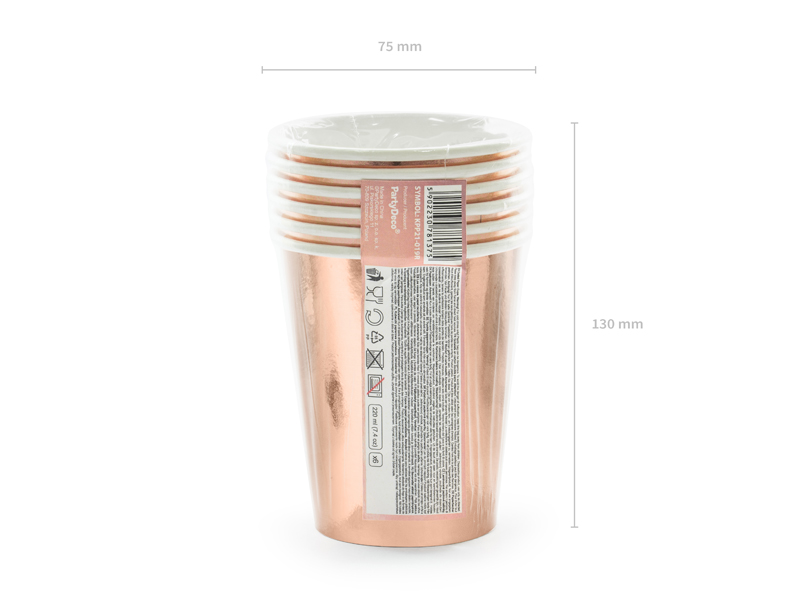 Paper cups in rose gold colour with white inscription She said yes!, hold up to 220 ml (7.4 oz.). Beverage cups bear the printed marking required by Commission Implementing Regulation (EU) 2020/2151 of 17 December 2020 laying down rules on harmonised marking specifications on single-use plastic products listed in Part D of the Annex to Directive (EU) 2019/904 of the European Parliament and of the Council on the reduction of the impact of certain plastic products on the environment. The product is labelled only in Polish, German, Czech, French, Dutch, Slovak, Slovenian and Bulgarian.