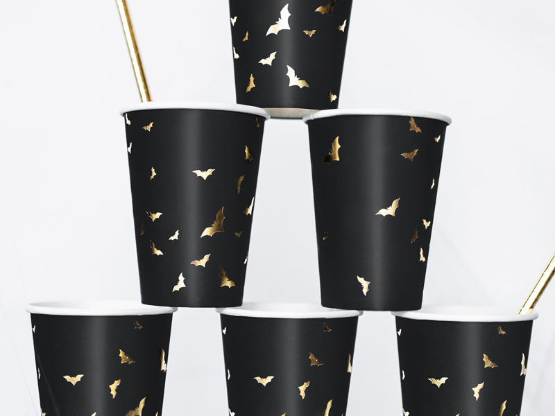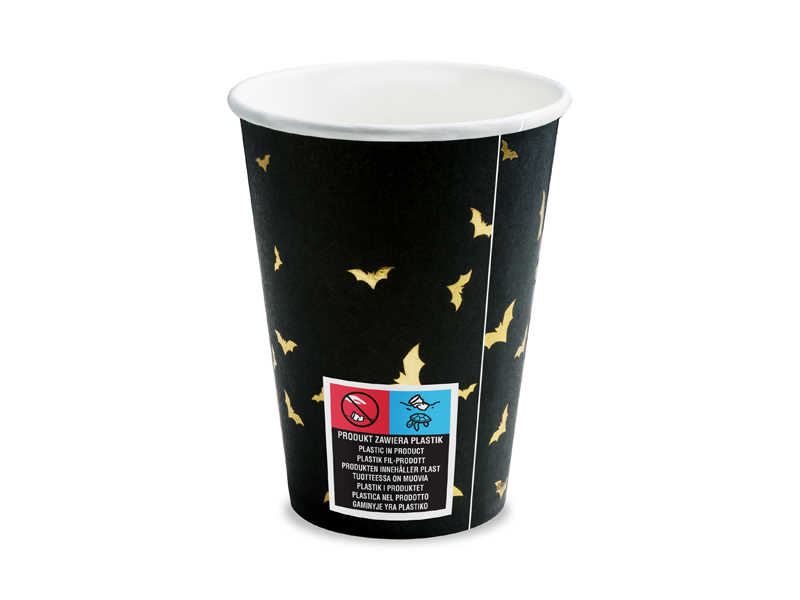 Paper cups Trick or Treat, black with gold pattern, hold up to 220 ml (7.4 oz). Beverage cups bear the printed marking required by Commission Implementing Regulation (EU) 2020/2151 of 17 December 2020 laying down rules on harmonised marking specifications on single-use plastic products listed in Part D of the Annex to Directive (EU) 2019/904 of the European Parliament and of the Council on the reduction of the impact of certain plastic products on the environment. The product is labelled only in Polish, English, Maltese, Swedish, Finnish, Danish, Italian and Lithuanian.