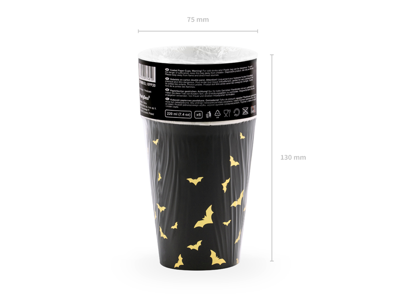 Paper cups Trick or Treat, black with gold pattern, hold up to 220 ml (7.4 oz). Beverage cups bear the printed marking required by Commission Implementing Regulation (EU) 2020/2151 of 17 December 2020 laying down rules on harmonised marking specifications on single-use plastic products listed in Part D of the Annex to Directive (EU) 2019/904 of the European Parliament and of the Council on the reduction of the impact of certain plastic products on the environment. The product is labelled only in Polish, Spanish, Latvian, Estonian, Portuguese, Hungarian, Greek, Croatian and Romanian.
