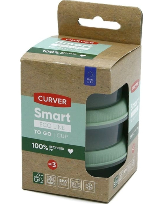 Контейнеры Curver 0800956Q19 это набор из 3-х круглых контейнеров объёмом 0,08 литра каждый, предназначенных для соусов, приправ или небольших порций пищи. Они выполнены из переработанного пластика серии Smart Eco To Go и имеют мягко‑зелёный цвет. Подходят для использования в микроволновой печи, холодильнике и посудомоечной машине.