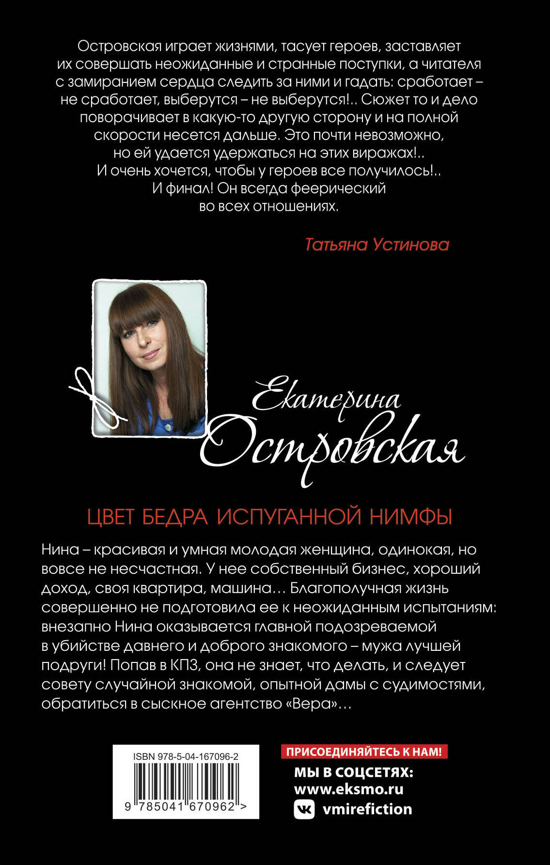 Нина - красивая и умная молодая женщина, одинокая, но вовсе не несчастная. У нее собственный бизнес, хороший доход, своя квартира, машина… Благополучная жизнь совершенно не подготовила ее к неожиданным испытаниям: внезапно Нина оказывается главной подозреваемой в убийстве давнего и доброго знакомого - мужа лучшей подруги! Попав в КПЗ, она не знает, что делать, и следует совету случайной знакомой обратиться в розыскное агентство Веры Бережной… Новый роман известной писательницы Екатерины Островской «Цвет бедра испуганной нимфы», который рекомендует сама Татьяна Устинова, входит в авторский цикл «Женское лицо частного сыска». Его главная героиня Вера Бережная - владелица частного розыскного агентства «Вера», снова ведет сложное и захватывающее расследование.| Издательство | Эксмо |