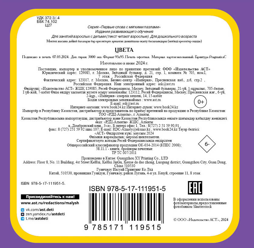 Маленькие книжечки с мягкими страничками и пазлами познакомят малыша с первыми словами и понятиями по темам «Домашние животные», «Овощи и фрукты», «Транспорт», «Цвета», «Игрушки» и со стихотворениями Агнии Барто из цикла «Игрушки». Удобный формат, загруглённые углы у книжек, прочные странички, пять фигурных пазлов в каждой книжке, яркие иллюстрации - это всё обязательно заинтересует малышей. Игра с мягкими пазлами поможет развить пространственное мышление и мелкую моторику, получить первые знания о формах, поиграть в сортер - найти своё место для каждого пазла. Фигурные пазлы могут стать самостоятельными игрушками - с ними можно устроить настоящее театральное представление! В серии «Первые слова с мягкими пазлами» шесть красивых книг, которые станут отличным подарком вашим крохам.| Издательство | ИЗДАТЕЛЬСТВО "АСТ" |