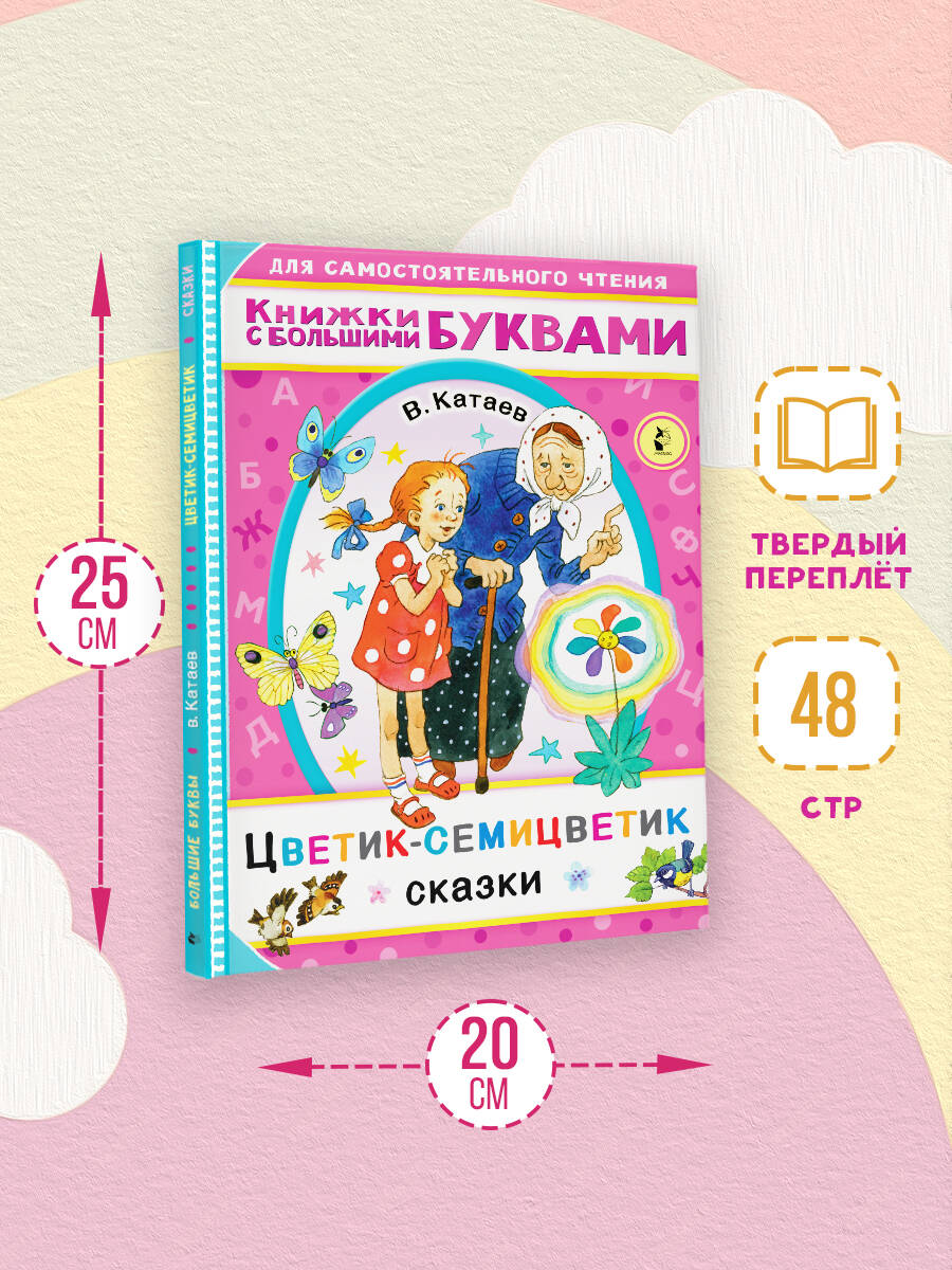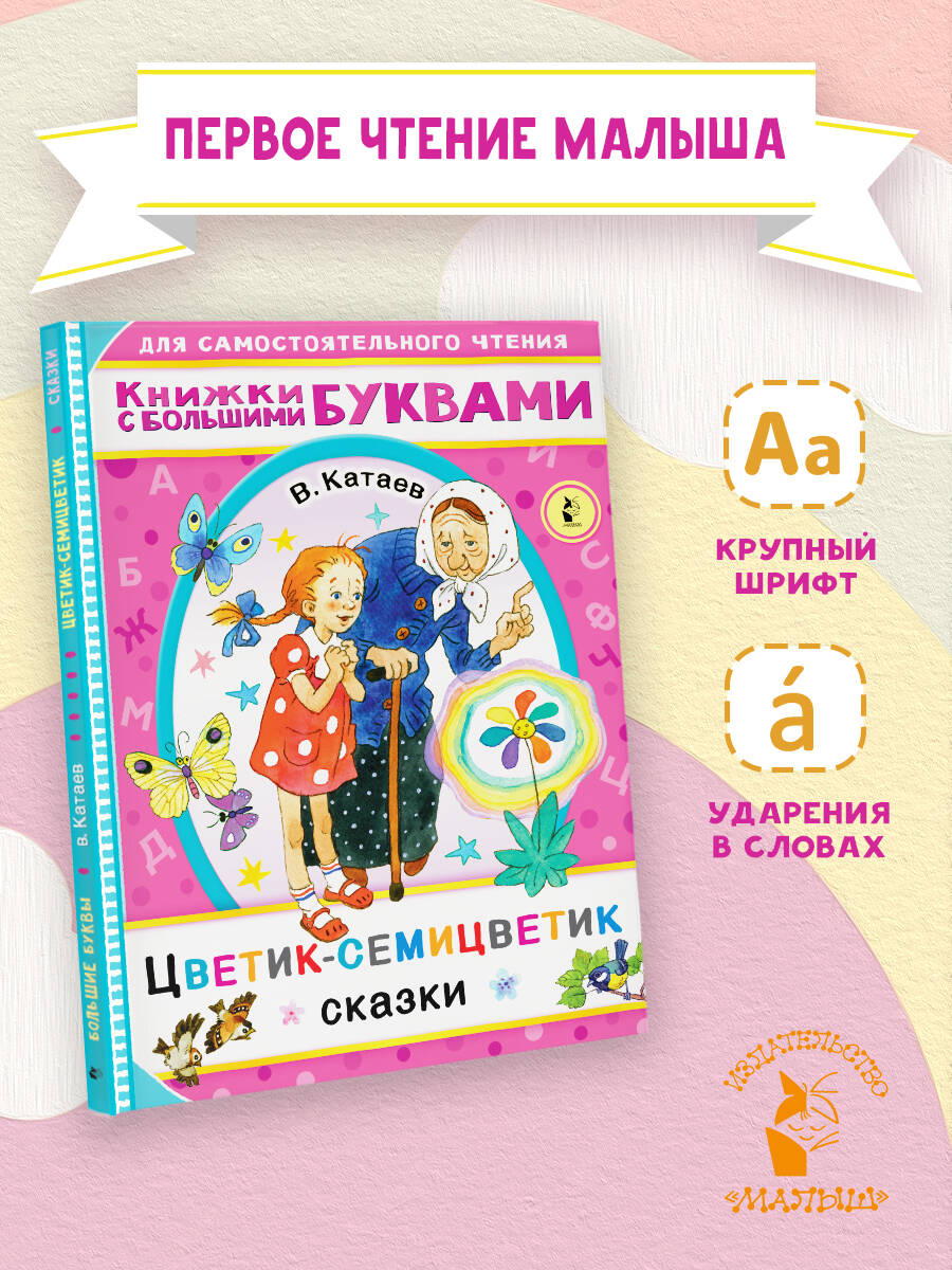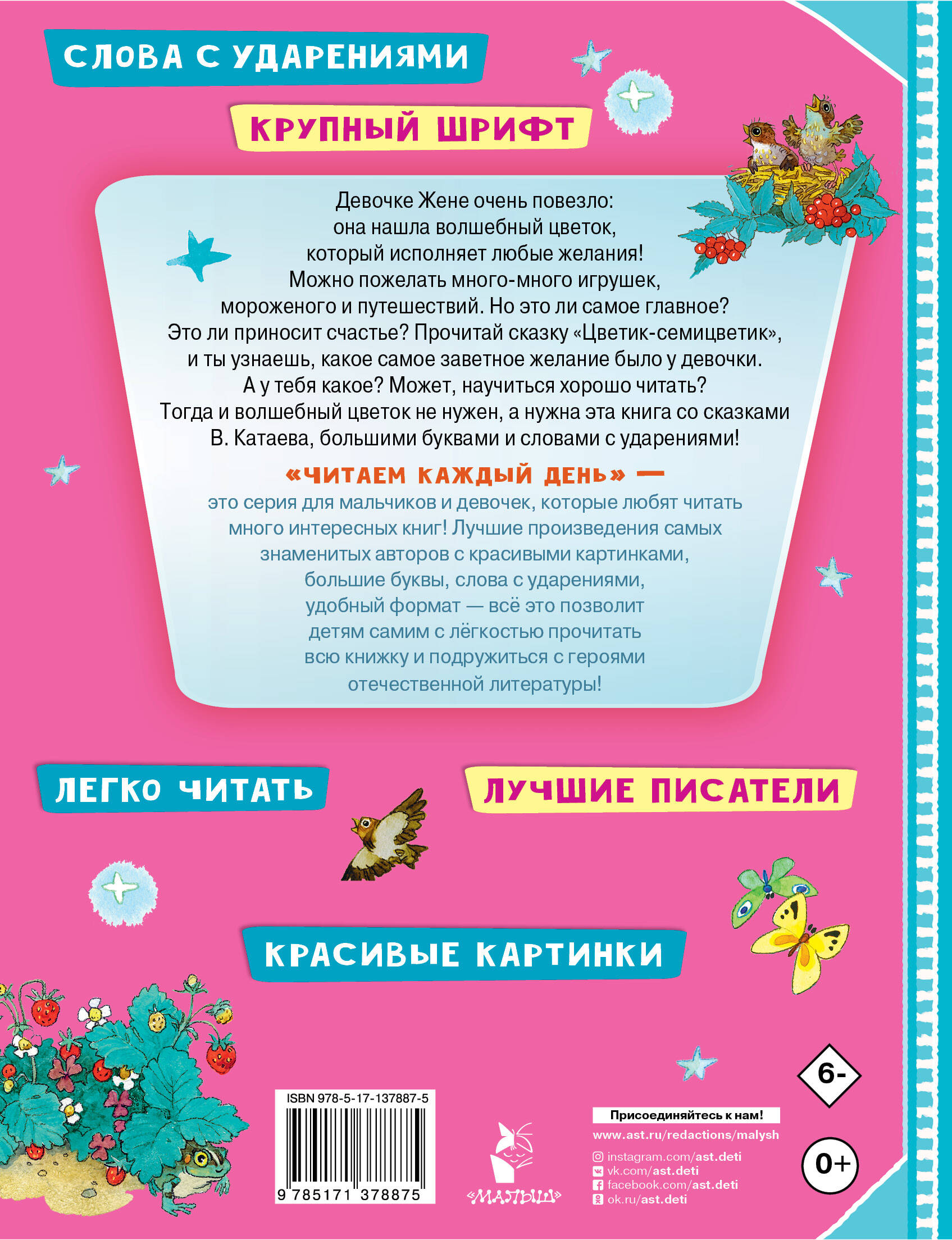 Девочке Жене очень повезло: она нашла волшебный цветок, который исполняет любые желания! Можно пожелать много-много игрушек, мороженого и путешествий. Но это ли самое главное? Это ли приносит счастье? Прочитай сказку В. Катаева "Цветик-семицветик", и ты узнаешь, какое самое заветное желание было у девочки. А у тебя какое? Может, научиться хорошо читать? Тогда и волшебный цветок не нужен, а нужна эта книга с большими буквами и словами с ударениями! "Читаем каждый день" - это серия для мальчиков и девочек, которые любят читать много интересных книг! Лучшие произведения самых знаменитых авторов с красивыми картинками, большие буквы, слова с ударениями, удобный формат - всё это позволит детям самим с лёгкостью прочитать всю книжку и подружиться с героями отечественной литературы!| Издательство | ИЗДАТЕЛЬСТВО "АСТ" |