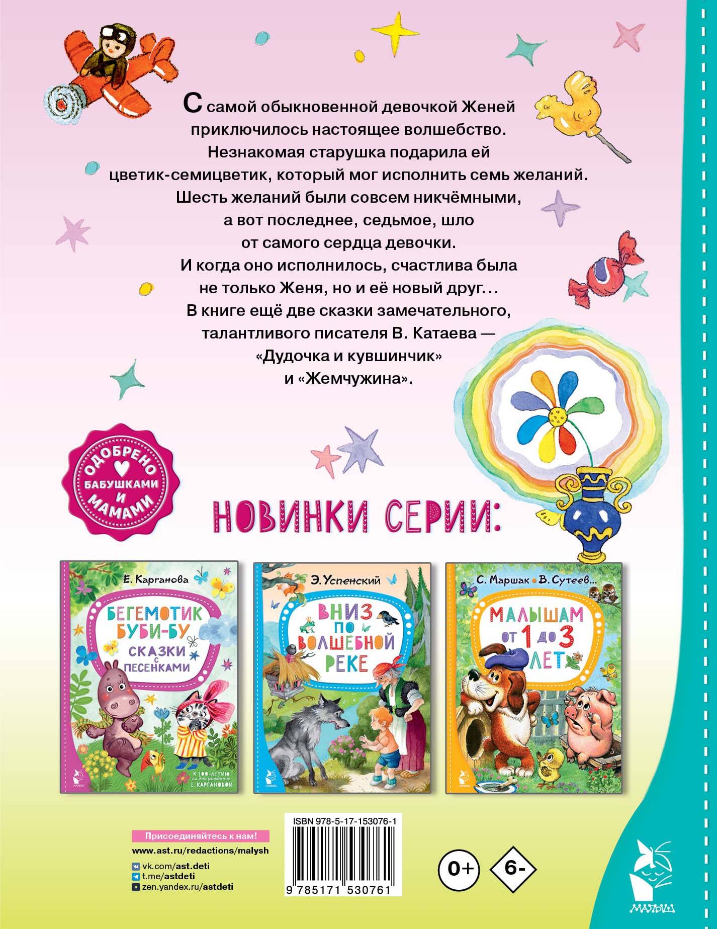 С самой обыкновенной девочкой Женей приключилось настоящее волшебство. Незнакомая старушка подарила ей цветик-семицветик, который мог исполнить семь желаний. Шесть желаний были совсем никчёмными, а вот последнее, седьмое, шло от самого сердца девочки. И когда оно исполнилось, счастлива была не только Женя, но и её новый друг... В книге ещё две сказки замечательного, талантливого писателя В. Катаева - «Дудочка и кувшинчик» и «Жемчужина».| Издательство | ИЗДАТЕЛЬСТВО "АСТ" |