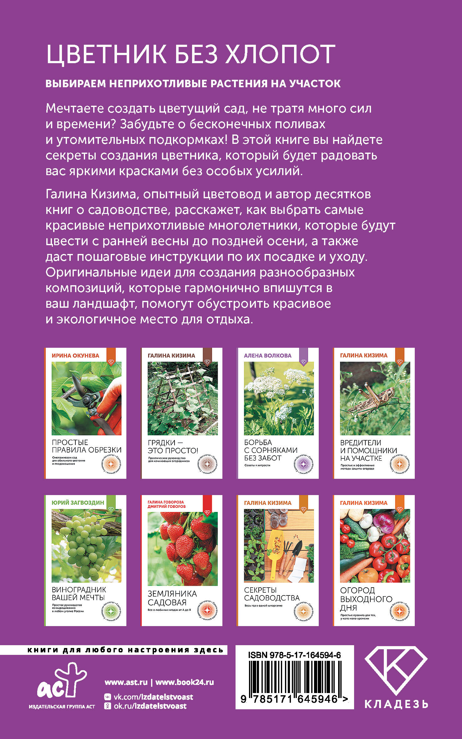 Мечтаете создать цветущий сад, не тратя много сил и времени? Забудьте о бесконечных поливах и утомительных подкормках! В этой книге вы найдете секреты создания цветника, который будет радовать вас яркими красками без особых усилий. Галина Кизима, опытный цветовод и автор десятков книг о садоводстве, расскажет, как выбрать самые красивые неприхотливые многолетники, которые будут цвести с ранней весны до поздней осени, а также даст пошаговые инструкции по их посадке и уходу. Оригинальные идеи для создания разнообразных композиций, которые гармонично впишутся в ваш ландшафт, помогут обустроить красивое и экологичное место для отдыха. Создайте свой райский уголок, не тратя время на сложные садовые работы!| Издательство | Издательство "АСТ" |