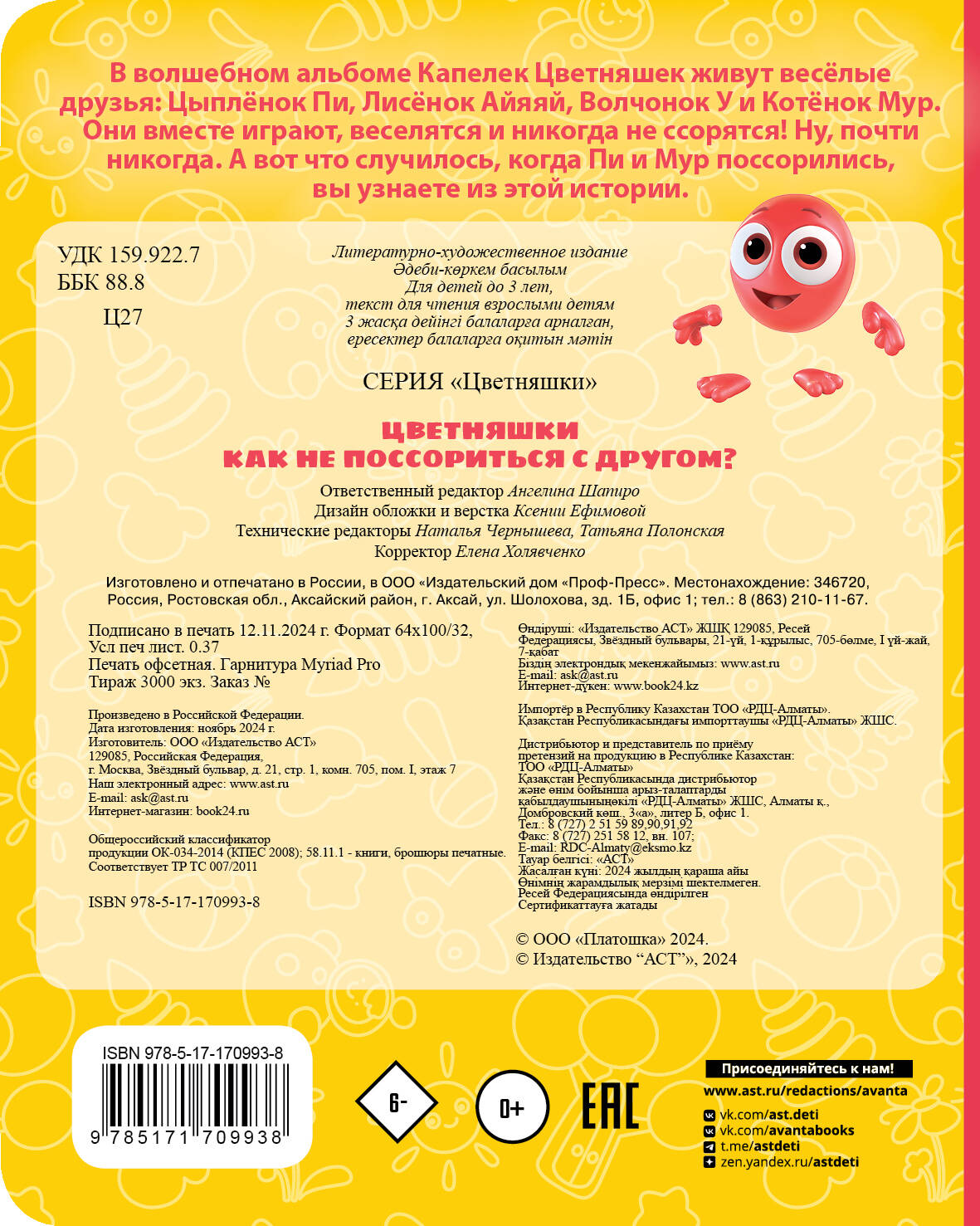 В волшебном альбоме Капелек Цветняшек живут веселые друзья: Цыплёнок Пи, Лисёнок Айяяй, Котёнок Мур, Волчонок У и Зайчонок Скок. Они вместе играют, веселятся и никогда не ссорятся! Ну, почти никогда. А вот что случилось, когда Пи и Мур поссорились, вы узнаете из этой истории. Малышам бывает очень непросто разобраться в своих эмоциях. Почему мне грустно? Почему я злюсь на лучшего друга? Почему сегодня мне что-то нравится, а завтра - нет? Книги серии "Цветняшки. Эмоциональный интеллект" помогут родителям объяснить своим детям на простых и понятных примерах, что такое чувства, какими они бывают и как во всем этом разобраться.| Издательство | Издательство "АСТ" |