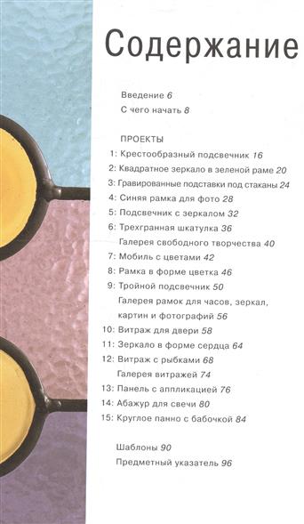 Любой человек, желающий украсить интерьер своего дома поделкой из цветного стекла, почерпнет из этой книги полезную информацию и идеи, с помощью которых сможет создать красивые вещи своими руками. В книге представлено пятнадцать проектов с пошаговыми инструкциями, позволяющими новичкам и людям с небольшим опытом работы со стеклом достичь поразительных результатов. Они отобраны таким образом, чтобы показать все разнообразие этого вида декорирования - от маленьких объемных изделий до красочных рам для зеркал и витражей.