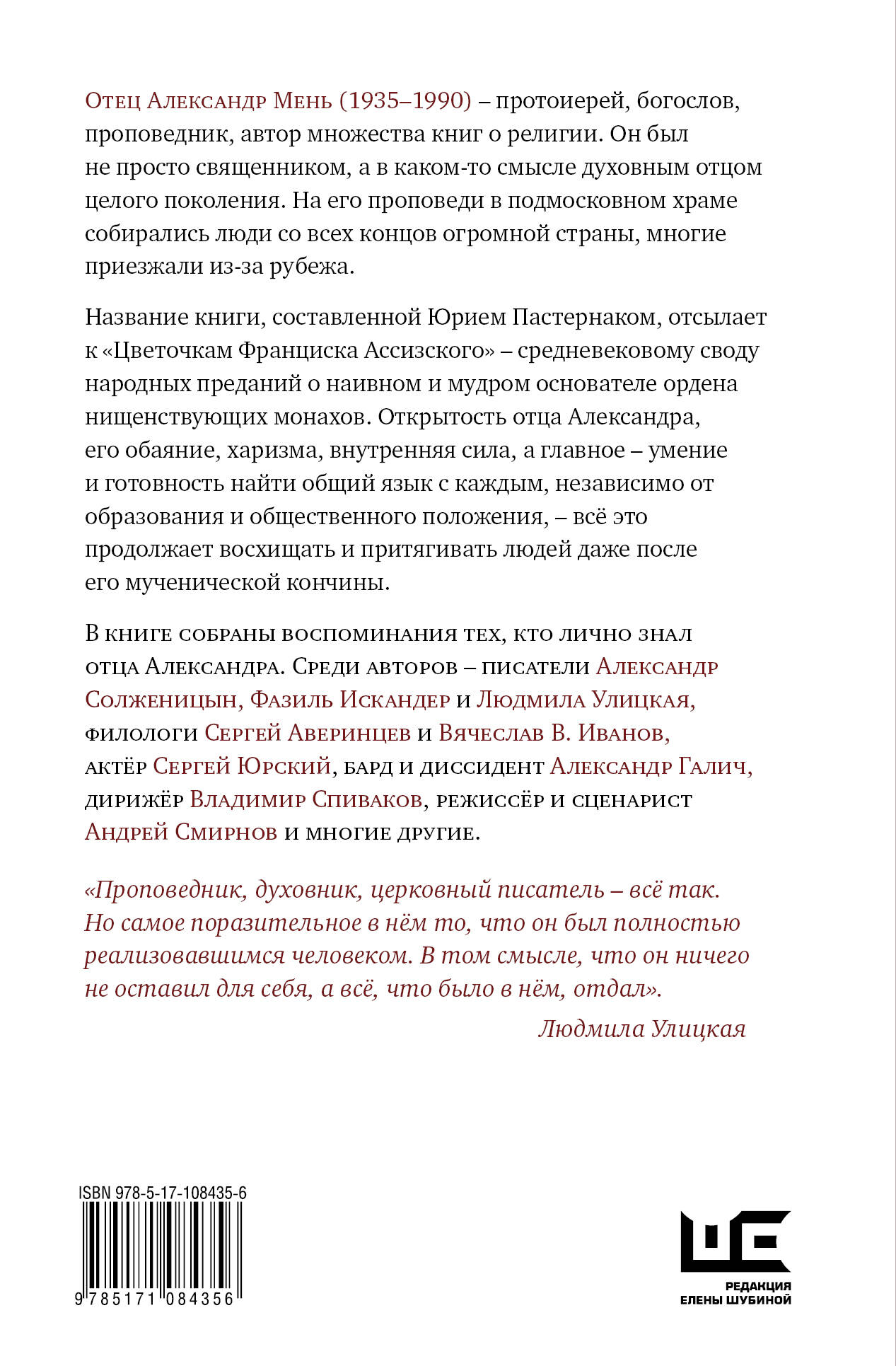 «Цветочки Александра Меня» - книга воспоминаний об отце Александре Мене (1935-1990), собранных Юрием Пастернаком. Книга эта напоминает «Цветочки Франциска Ассизского», средневековый свод народных преданий о наивном и мудром основателе ордена нищенствующих монахов. Александр Мень, обращавший в христианскую веру убежденных атеистов, фигура не менее яркая и совершенно особенная. В книге воспоминаниями об отце Александре делятся как простые прихожане из подмосковного села, где служил отец Александр, так и люди известные, зачастую приезжавшие к нему издалека. Среди них писатели Александр Солженицын, Фазиль Искандер и Людмила Улицкая, филолог Сергей Аверинцев, актёр Сергей Юрский, бард и диссидент Александр Галич, дирижёр Владимир Спиваков, режиссёр и сценарист Андрей Смирнов и многие другие. Десятки духовных чад Александра Меня рассказывают истории из его жизни, своими словами передают не вошедшие в собрание сочинений проповеди и личные, полученные на исповеди, наставления учителя.| Издательство | АСТ |