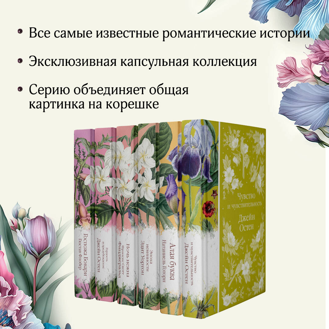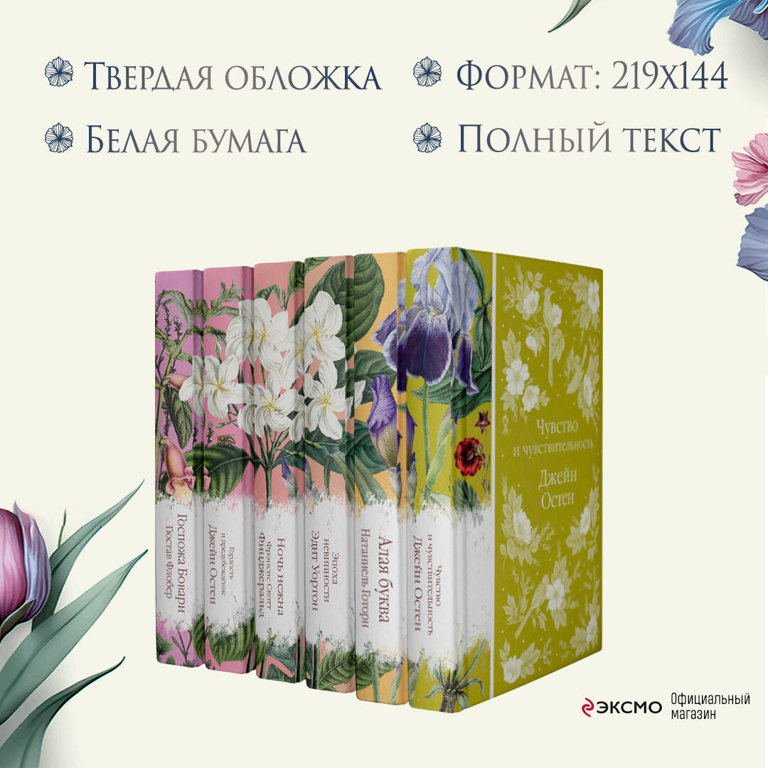 Коллекция элегантной классики - это пронзительная нежность, это сад, который шагнул к вам на книжную полку. Корешки коллекции собирают на полке цветочный орнамент. В комплект вошли книги «Госпожа Бовари», «Гордость и предубеждение», «Ночь нежна», «Эпоха невинности», «Алая буква», «Чувство и чувствительность» - шесть классических женских романов, которые приятно читать и приятно дарить.| Издательство | ООО "Издательство "Эксмо" |