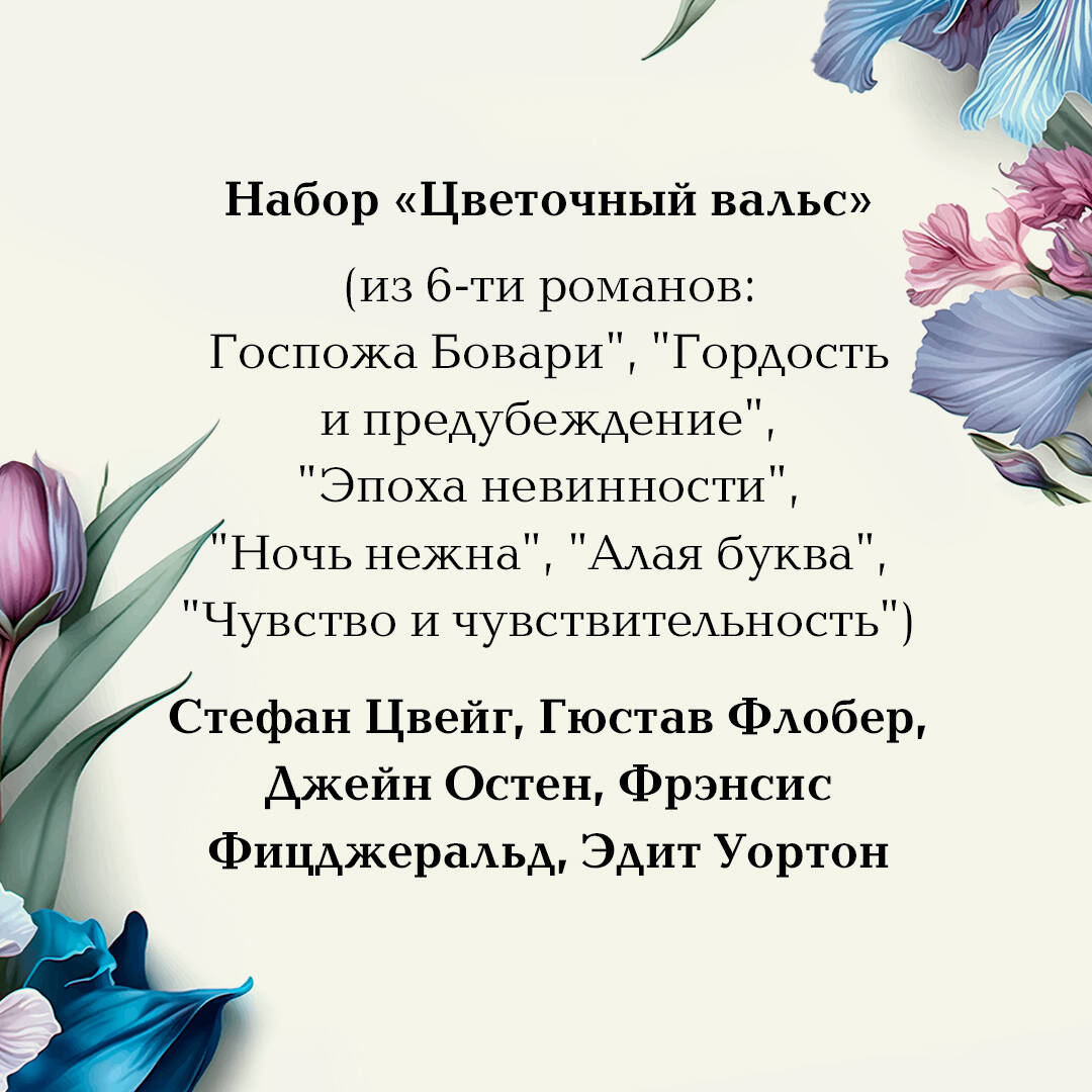 Аннотация: Цветочный вальс (комплект из 6-ти романов: Госпожа Бовари, Гордость и предубеждение, Эпоха невинности, Ночь нежна, Алая буква, Чувство и чувствительность)