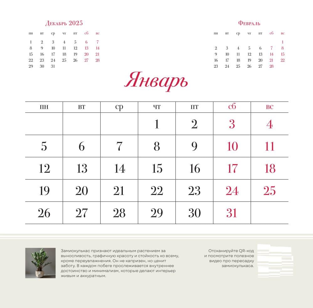 Календарь для тех, кто любит жить среди цветов, - 2026 год ждет вас! Каждый месяц в этом календаре - встреча с новым растением: с его настроением, привычками и секретами ухода. Стойкие и капризные, артистичные или скромные, но всегда вдохновляющие. 12 QR-кодов на видео и посты, где вас ждут советы и лайфхаки от Екатерины Кузнецовой, чтобы забота о растениях стала простой и приятной. Пусть интерьер оживает, а подоконник всегда радует цветами.| Издательство | АСТ |