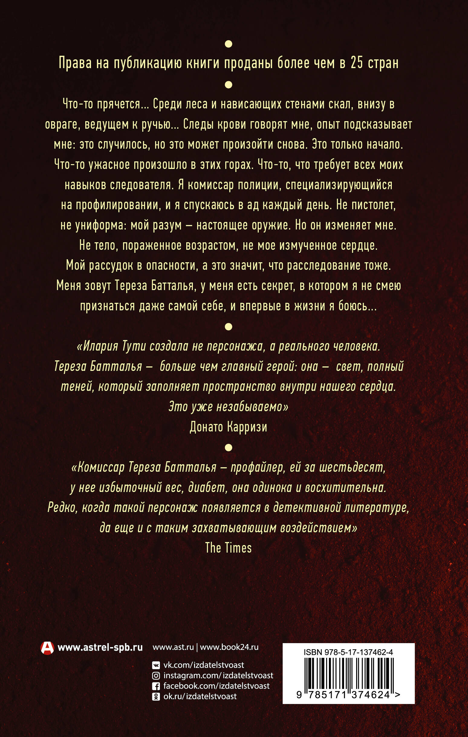 Что-то прячется… Среди леса и нависающих стенами скал, внизу в овраге, ведущем к ручью… Следы крови говорят мне, опыт подсказывает мне: это случилось, но это может произойти снова. Это только начало. Что-то ужасное произошло в этих горах. Что-то, что требует всех моих навыков следователя. Я комиссар полиции, специализирующийся на профилировании, и я спускаюсь в ад каждый день. Не пистолет, не униформа: мой разум - настоящее оружие. Но он изменяет мне. Не тело, пораженное возрастом, не мое измученное сердце. Мой рассудок в опасности, а это значит, что расследование тоже. Меня зовут Тереза Батталья, у меня есть секрет, в котором я не смею признаться даже самой себе, и впервые в жизни я боюсь…| Издательство | ИЗДАТЕЛЬСТВО "АСТ" |