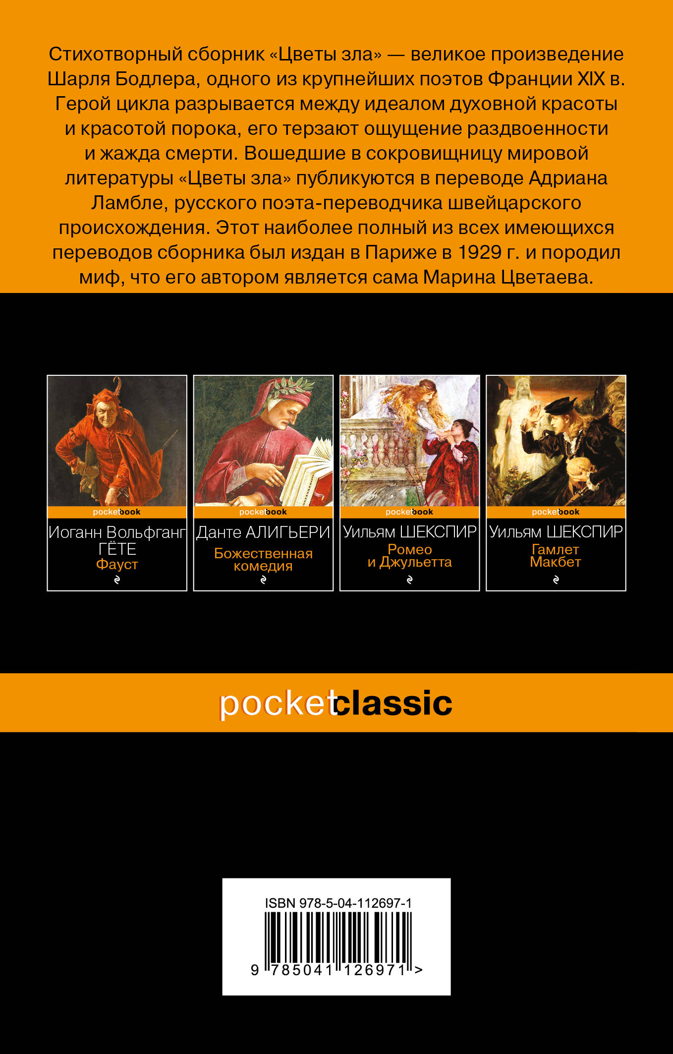 Стихотворный сборник «Цветы зла» - великое произведение Шарля Бодлера, одного из крупнейших поэтов Франции XIX века. Герой цикла разрывается между идеалом духовной красоты и красотой порока, его терзают ощущение раздвоенности и жажда смерти. Вошедшие в сокровищницу мировой литературы «Цветы зла» публикуются в переводе Адриана Ламбле, русского поэта-переводчика швейцарского происхождения. Этот наиболее полный из всех имеющихся переводов сборника был издан в Париже в 1929 г. и породил миф, что его автором является сама Марина Цветаева. «В работе Адриана Ламбле есть одно большое достоинство: она сделана очень тщательно и, видимо, с большой любовью. <...> Перелистывать и читать ее приятно. На ней лежит отпечаток общей культурности. Есть в ней слабый, но все-таки еще не окончательно исчезнувший отблеск одного из самых глубоких дарований, которые когда-либо были на земле», - писал Георгий Адамович
