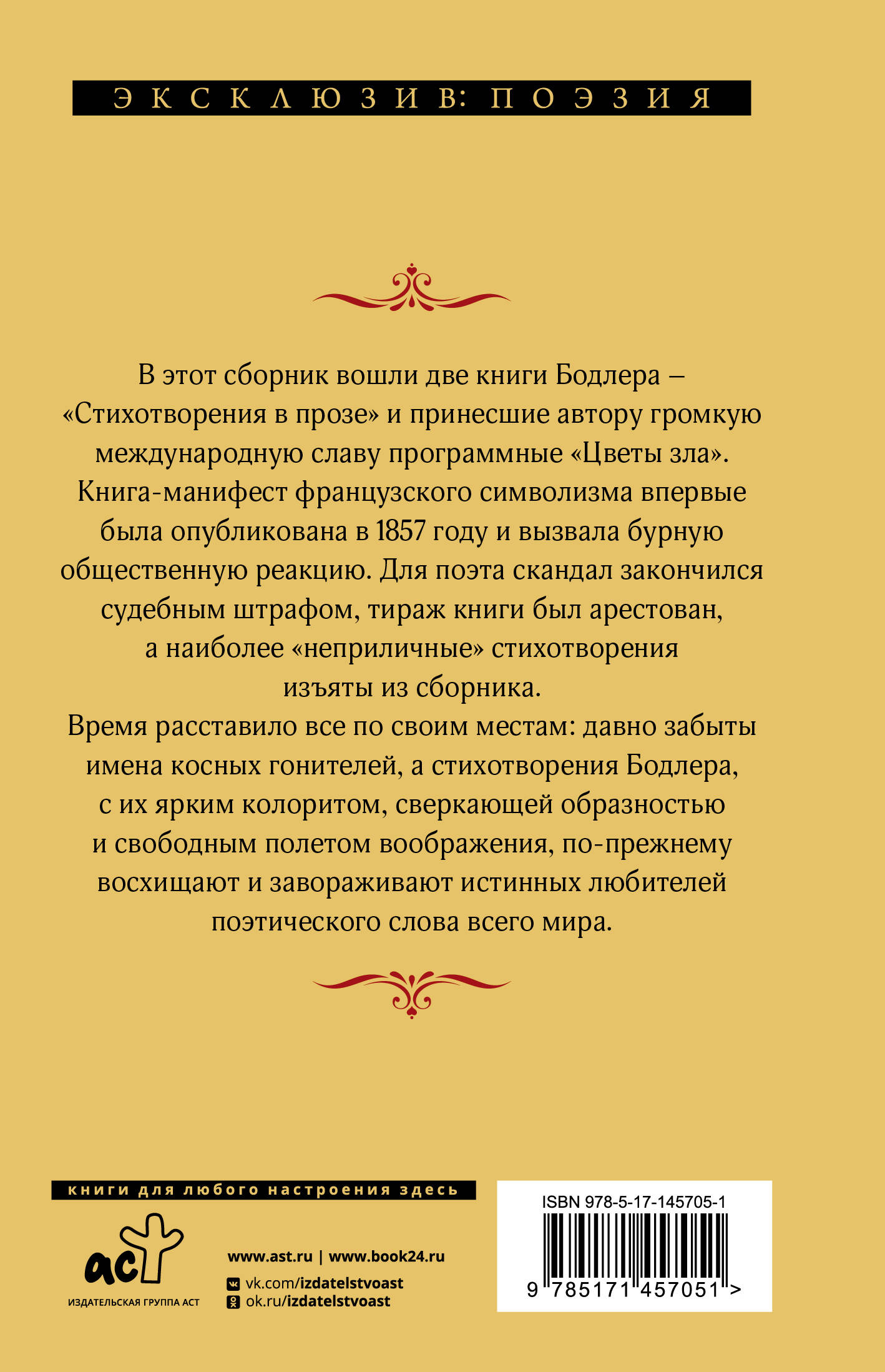В этот сборник вошли две книги Бодлера - "Стихотворения в прозе" и принесшие автору громкую международную славу программные "Цветы зла". Книга-манифест французского символизма впервые была опубликована в 1857 году и вызвала бурную общественную реакцию. Для поэта скандал закончился судебным штрафом, тираж книги был арестован, а наиболее "неприличные" стихотворения изъяты из сборника. Время расставило все по своим местам: давно забыты имена косных гонителей, а стихотворения Бодлера, с их ярким колоритом, сверкающей образностью и свободным полетом воображения, по-прежнему восхищают и завораживают истинных любителей поэтического слова всего мира.