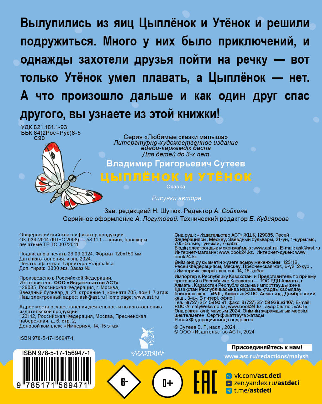 Вылупились из яиц Цыплёнок и Утёнок и решили подружиться. Много у них было приключений, и однажды захотели друзья пойти на речку - вот только Утёнок умел плавать, а Цыплёнок - нет. А что произошло дальше и как один друг спас другого, вы узнаете из этой книжки! Владимир Григорьевич Сутеев - классик отечественной детской литературы. Его сказки - простые, понятные, но по-своему увлекательные - особенно интересны самым маленьким читателям. Ведь почти каждая фраза в них сопровождается рисунком, и историю можно проследить по картинкам. Эта книга предназначена именно для малышей: в ней яркие рисунки и крупные буквы, плотный картон не порвется при чтении, а скругленные уголки не повредят маленькие пальчики.| Издательство | ИЗДАТЕЛЬСТВО "АСТ" |