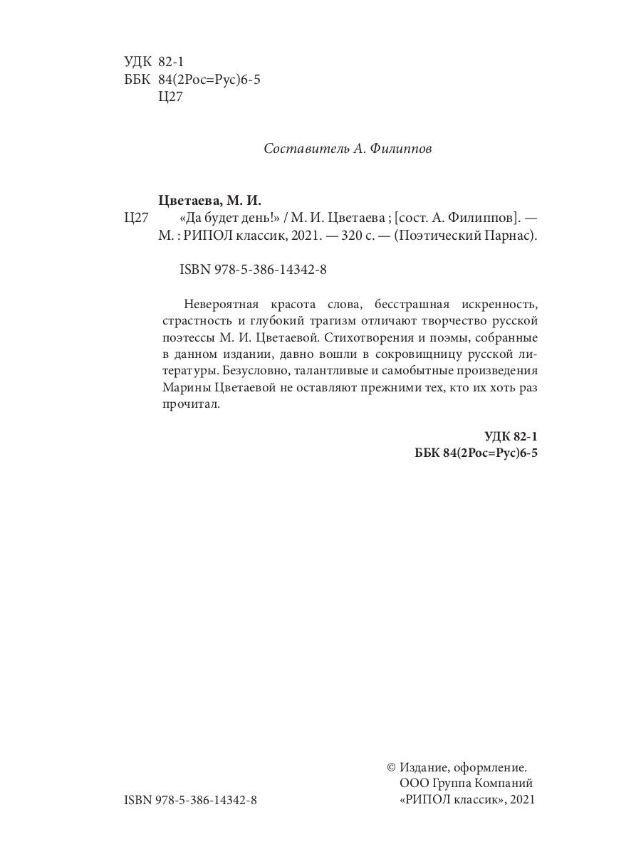 Невероятная красота слова, бесстрашная искренность, страстность и глубокий трагизм отличают творчество русской поэтессы М. И. Цветаевой. Стихотворения и поэмы, собранные в данном издании, давно вошли в сокровищницу русской литературы. Безусловно, талантливые и самобытные произведения Марины Цветаевой не оставляют прежними тех, кто их хоть раз прочитал.| Издательство | Рипол Классик |