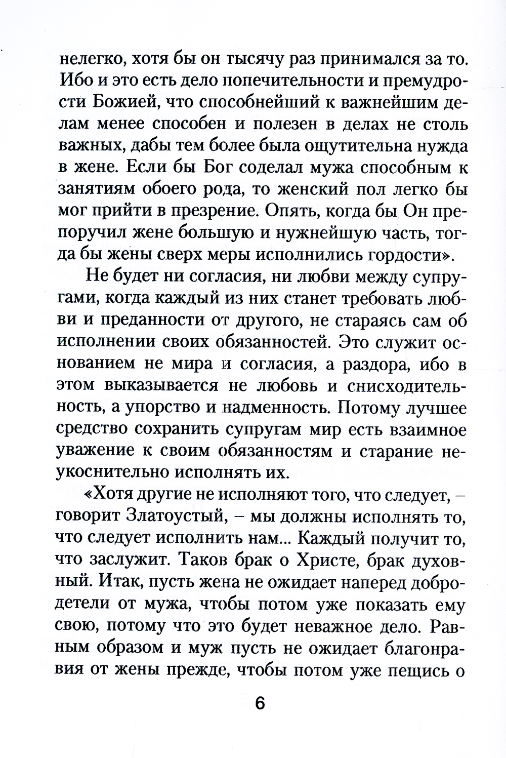 Когда жених сделал благоразумный выбор невесты и невеста выбор жениха, и испрошено благословение Божие сочетавающимися, этим не все еще сделано для их счастия в брачной жизни. Они должны так вести себя, так устроить свои взаимные отношения, чтобы быть достойными благословения Божия и самим не навлечь на себя несчастья; чтобы брак, источник чистых радостей, не сделался для них источником безчисленных бедствий по их собственной вине. «Брак есть пристанище, - говорит Златоустый, - но вместе и кораблекрушение - не сам по себе, а по расположению тех, кои худо пользуются им. Ибо тот, кто наблюдает в нем законы, нaxoдит в доме и жене своей утешение и облегчение от всех неприятностей, встречаемых в других местах. А тот, кто неблагоразумно и случайно приступает к сему делу - хотя и наслаждается спокойствием в судах или других местах, встречает неприятности и огорчения в своем доме».| Издательство | Домострой |