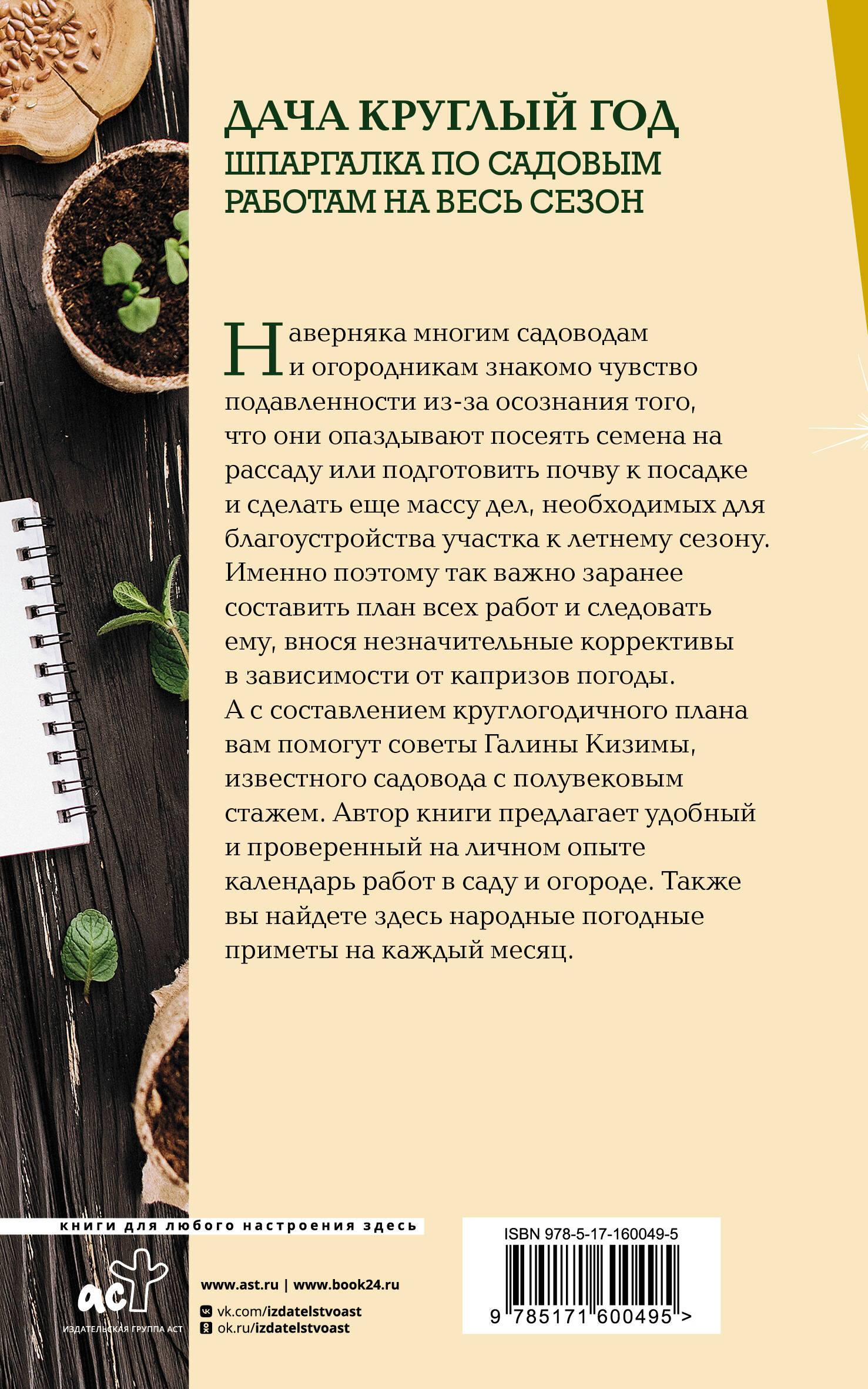 Наверняка многим садоводам и огородникам знакомо чувство подавленности из-за осознания того, что они опаздывают посеять семена на рассаду или подготовить почву к посадке и сделать еще массу дел, необходимых для благоустройства участка к летнему сезону. Именно поэтому так важно заранее составить план всех работ и следовать ему, внося незначительные коррективы в зависимости от капризов погоды. А с составлением круглогодичного плана вам помогут советы Галины Кизимы, известного садовода с полувековым стажем. Автор книги предлагает удобный и проверенный на личном опыте календарь работ в саду и огороде. Также вы найдете здесь народные погодные приметы на каждый месяц.| Издательство | Издательство "АСТ" |
