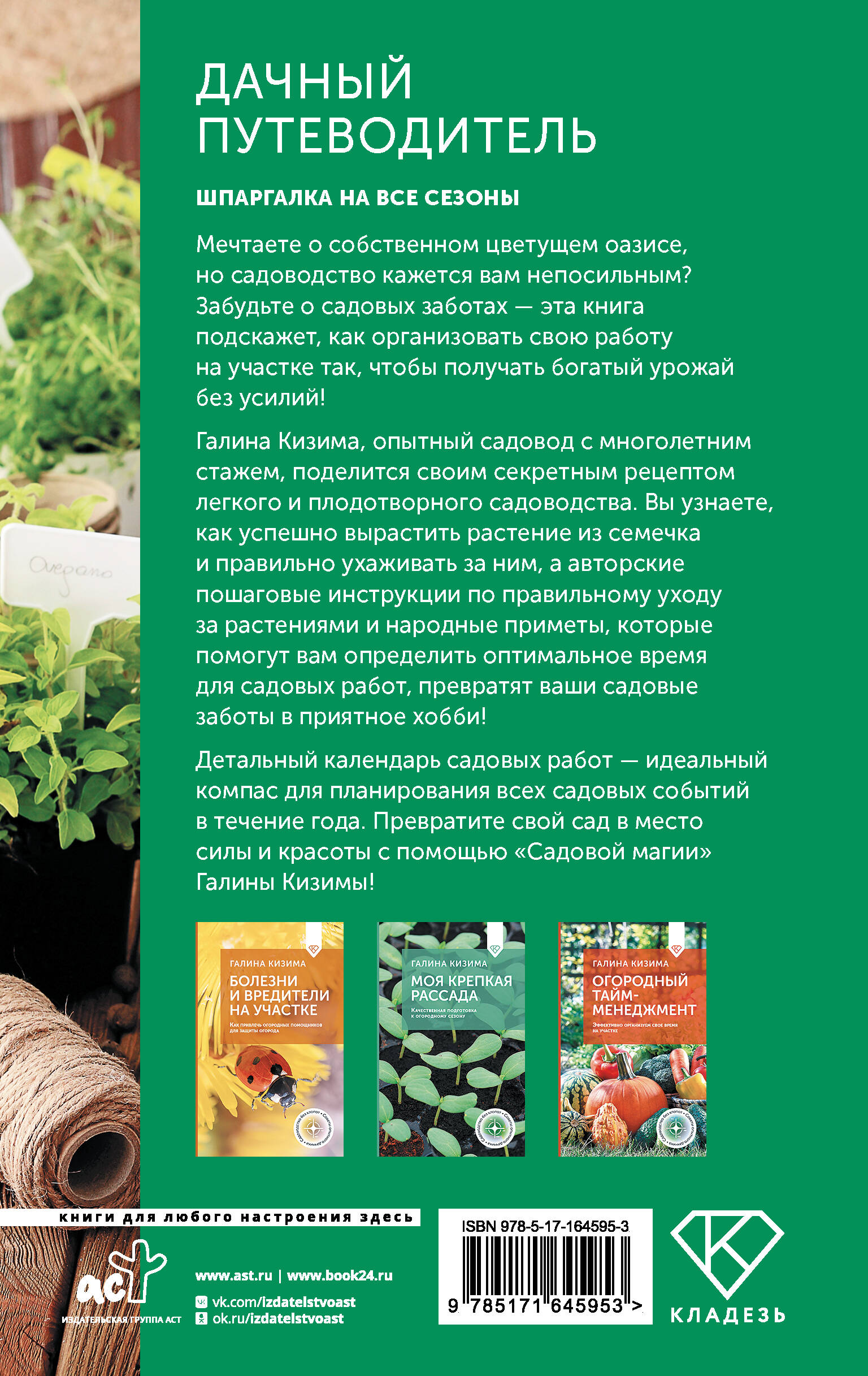 Мечтаете о собственном цветущем оазисе, но садоводство кажется вам непосильным? Забудьте о садовых заботах - эта книга подскажет, как организовать свою работу на участке так, чтобы получать богатый урожай без усилий! Галина Кизима, опытный садовод с многолетним стажем, поделится своим секретным рецептом легкого и плодородного садоводства. Вы узнаете, как успешно вырастить растение из семечка и правильно ухаживать за ним, а авторские пошаговые инструкции и народные приметы помогут вам определить оптимальное время для садовых работ и превратят их в приятное хобби! Детальный календарь садовых работ - идеальный компас для планирования всех садовых событий в течение года. Превратите свой сад в место силы и красоты с помощью "садовой магии" Галины Кизимы!| Издательство | Издательство "АСТ" |