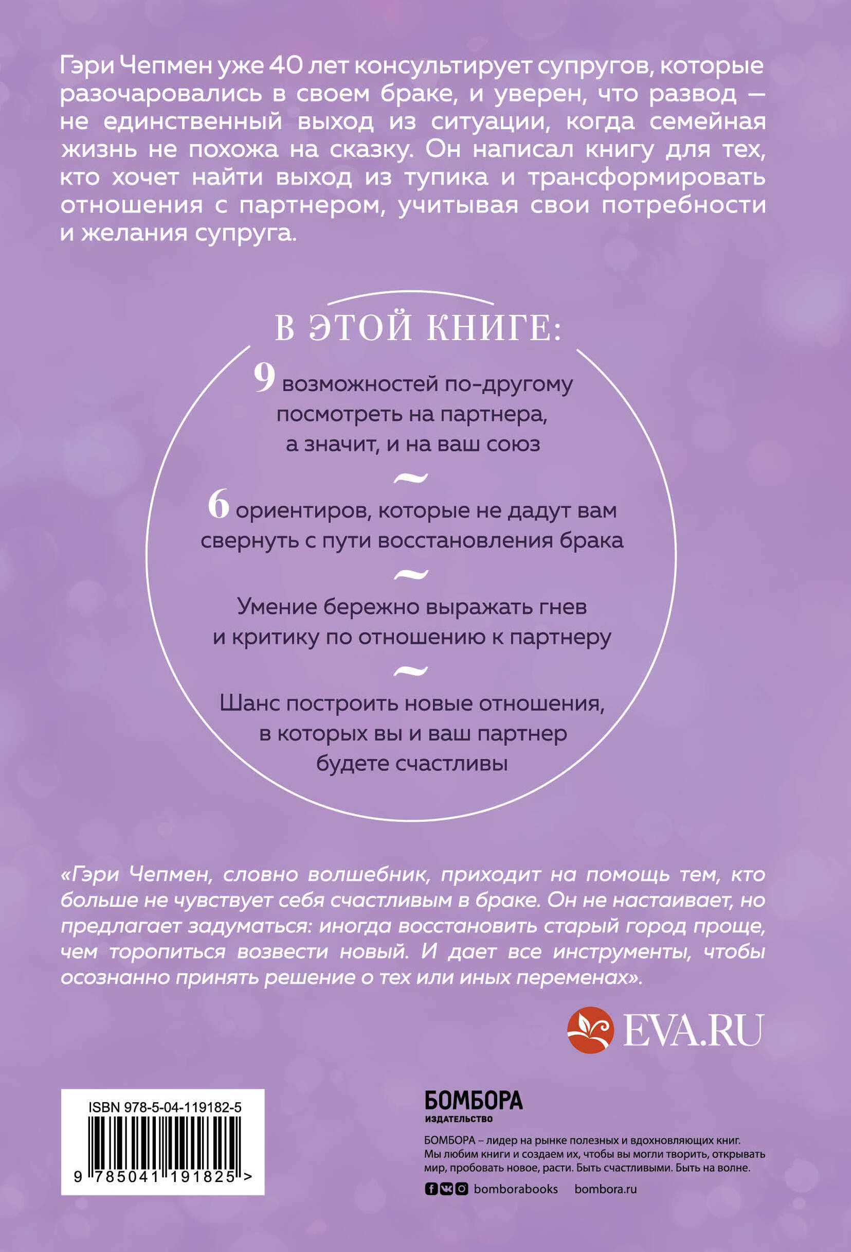 Гэри Чепмен уже 40 лет консультирует супругов, которые разочаровались в своем браке, и уверен, что развод - не единственный выход из ситуации, когда семейная жизнь не похожа на сказку. Он написал книгу для тех, кто хочет найти выход из тупика и трансформировать отношения с партнером, учитывая свои потребности и желания супруга. В этой книге: - 9 возможностей по-другому посмотреть на партнера, а значит, и на ваш союз; - 6 ориентиров, которые не дадут вам свернуть с пути восстановления брака; - умение бережно выражать гнев и критику по отношению к партнеру; - шанс построить новые отношения, в которых вы и ваш партнер будете счастливы. ОТЗЫВ: «Гэри Чепмен, словно волшебник, приходит на помощь тем, кто больше не чувствует себя счастливым в браке. Он не настаивает, но предлагает задуматься: иногда восстановить старый город проще, чем торопиться возвести новый. И дает все инструменты, чтобы осознанно принять решение о тех или иных переменах». - Eva.ru| Издательство | ООО "Издательство "Эксмо" |