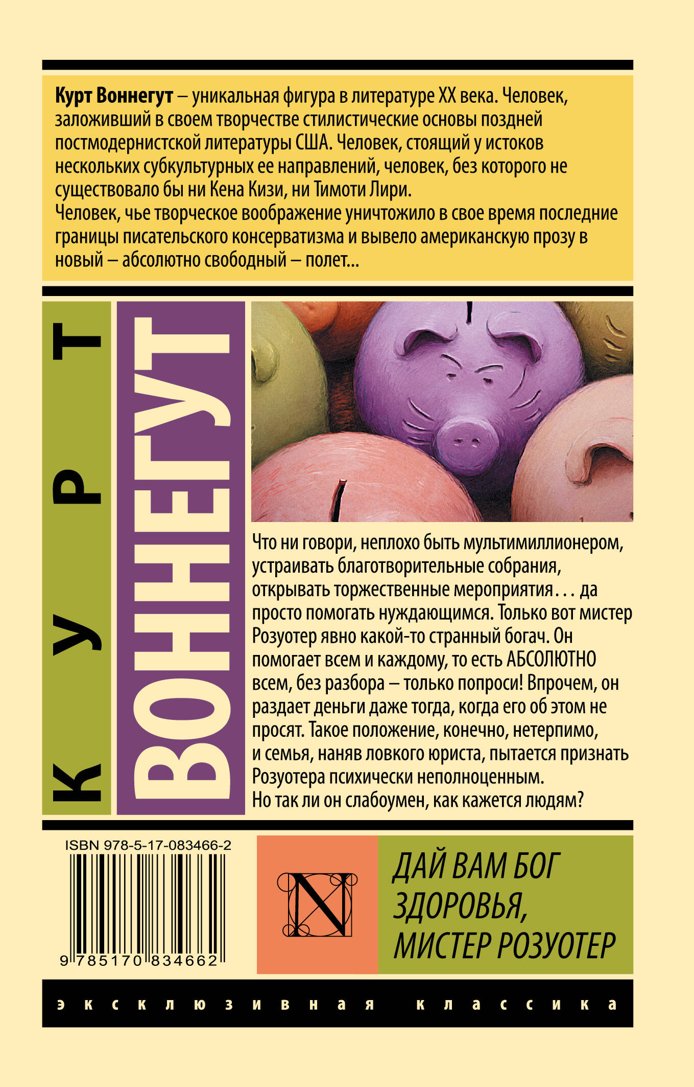 Что ни говори, неплохо быть мультимиллионером - устраивать благотворительные собрания, открывать торжественные мероприятия… да просто помогать нуждающимся. Только вот мистер Розуотер явно какой-то странный богач. Он помогает всем и каждому, то есть АБСОЛЮТНО всем, без разбора - только попроси! Впрочем, он раздает деньги даже тогда, когда его об этом не просят. Такое положение, конечно, нетерпимо, и семья, наняв ловкого юриста, пытается признать Розуотера психически неполноценным. Но так ли он слабоумен, как кажется людям?| Издательство | Издательство "АСТ" |