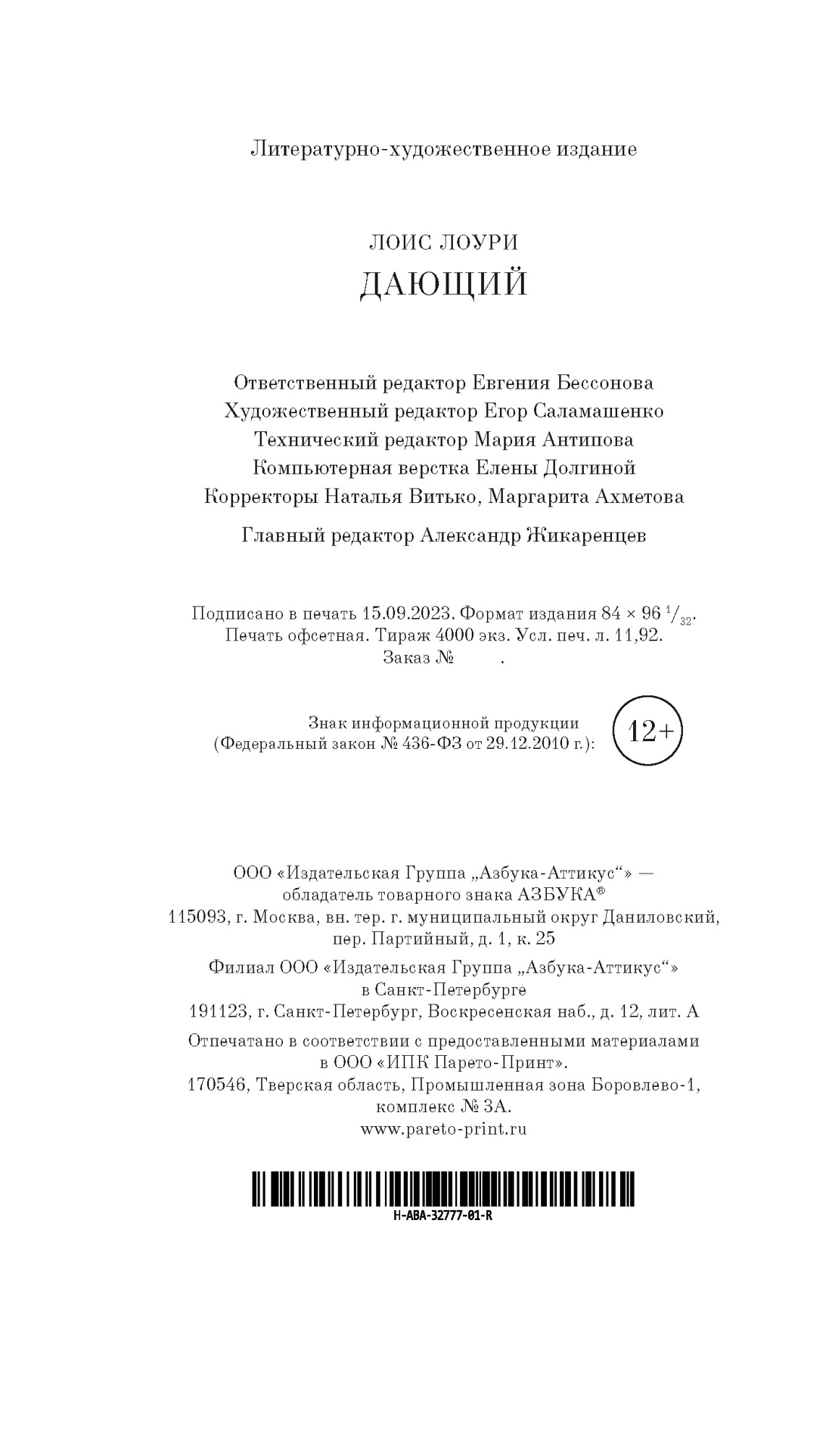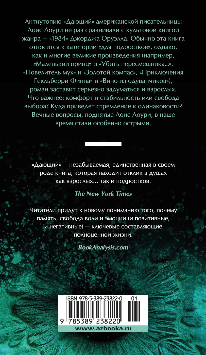В мире, где живет Джонас, нет сильной боли, нет голода, нет войн. А еще нет самостоятельных решений: для каждого члена коммуны выбирается подходящая профессия, муж или жена и даже дети. Джонасу тревожно, ведь совсем скоро объявят и его будущее занятие. Кем он станет? Окажется ли ему по душе назначенная профессия? Но, как выясняется, Старейшины отвели Джонасу особую роль. Он становится следующим Принимающим Воспоминания. Мальчик знакомится со стариком, хранящим память о реальном мире, и жизнь Джонаса переворачивается с ног на голову...| Издательство | Азбука |