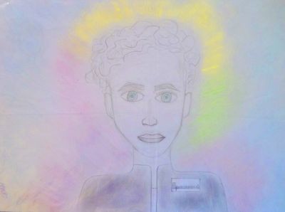 "Это портрет главного героя Джонаса, его нужно поместить на страницу 3 книги «Дающий» Лоиса Лоури. Я считаю, что этот рисунок должен быть, потому что в книге говориться о том, что Джонас был не таким как все. У него был удивительный цвет глаз. К тому же он воспринимал цвет. Мне не хватило изображения главного героя в начале книги, именно поэтому я решила исправить этот недочет".