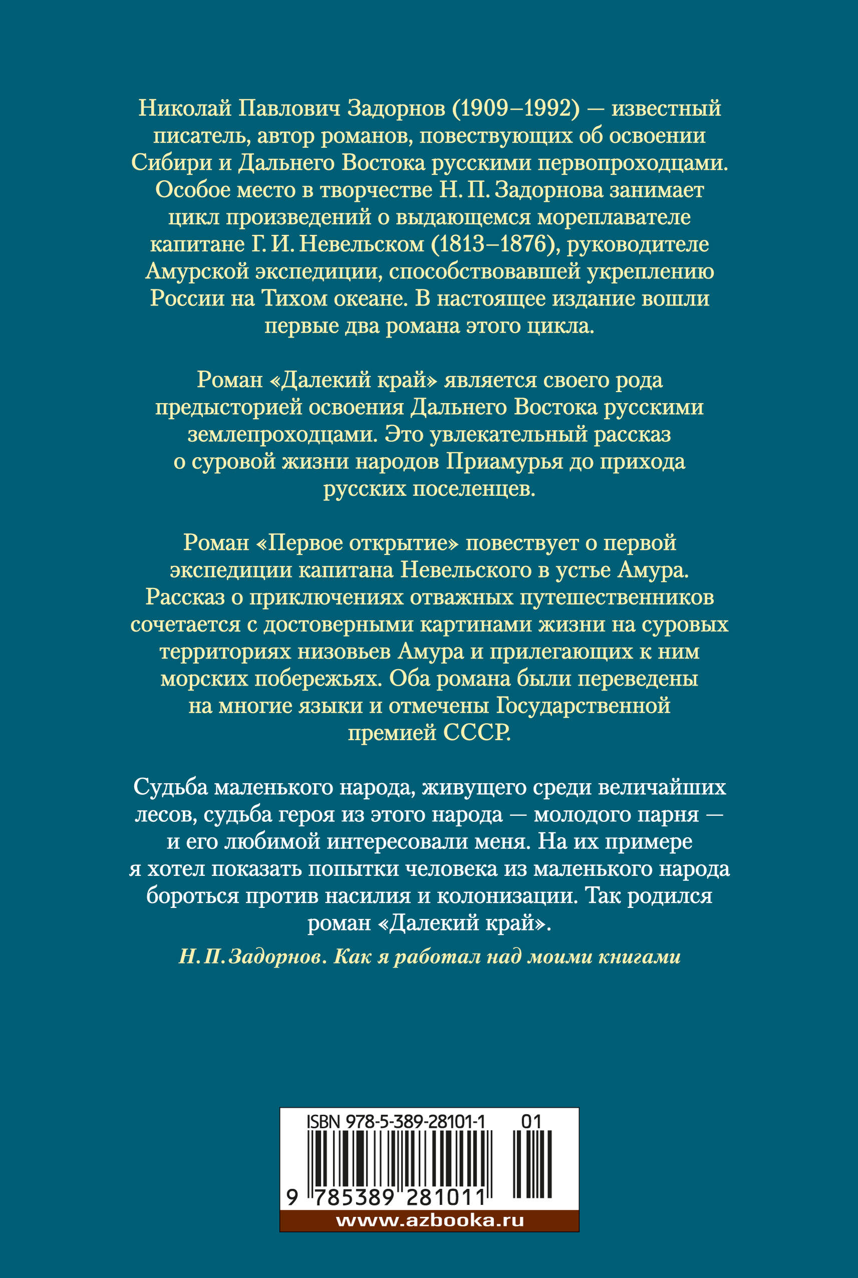 Николай Павлович Задорнов (1909-1992) - известный писатель, автор романов, повествующих об освоении Сибири и Дальнего Востока русскими первопроходцами. Особое место в творчестве Н. П. Задорнова занимает цикл произведений о выдающемся мореплавателе капитане Г. И. Невельском (1813-1876), руководителе Амурской экспедиции, способствовавшей укреплению России на Тихом океане. В настоящее издание вошли первые два романа этого цикла. Роман "Далекий край" является своего рода предысторией освоения Дальнего Востока русскими землепроходцами. Это увлекательный рассказ о суровой жизни народов Приамурья до прихода русских поселенцев. Роман "Первое открытие" повествует о первой экспедиции капитана Невельского в устье Амура. Рассказ о приключениях отважных путешественников сочетается с достоверными картинами жизни на суровых территориях низовьев Амура и прилегающих к ним морских побережьях. Оба романа были переведены на многие языки и отмечены Государственной премией СССР.| Издательство | Азбука-Аттикус Издат.группа ООО |
