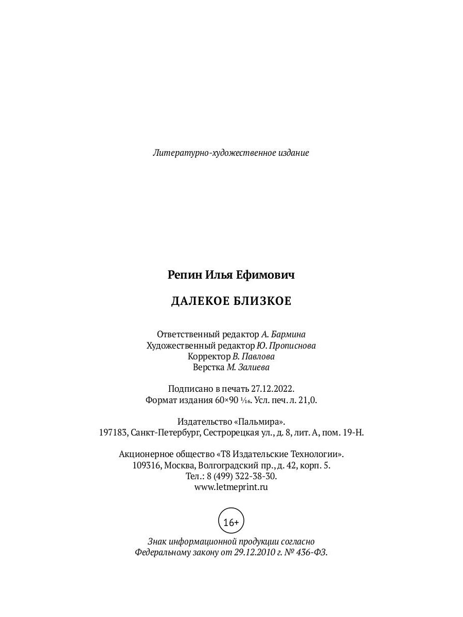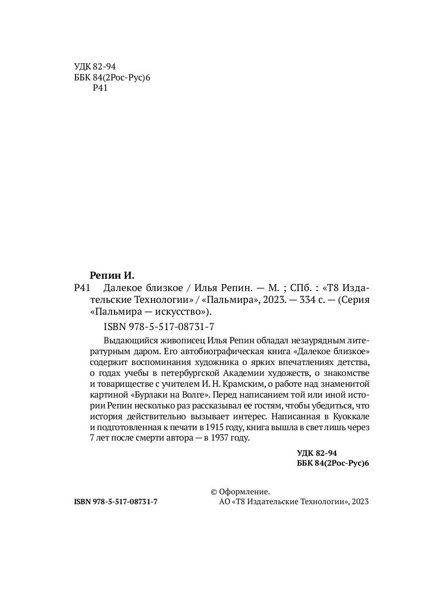 Илья Ефимович Репин (1844-1930) - выдающийся живописец, педагог, действительный член Императорской Академии художеств, мастер портрета, исторических и бытовых полотен. Как педагог воспитал целую плеяду прославленных художников: Б.М. Кустодиева, И.Э. Грабаря, В.А. Серова и других. Также обладал незаурядным литературным даром. Автобиографическая книга "Далекое близкое" содержит воспоминания художника о ярких впечатлениях детства, о годах учебы в петербургской Академии художеств, о знакомстве и товариществе с учителем И.Н. Крамским, о работе над знаменитой картиной "Бурлаки на Волге". Перед написанием той или иной истории, Репин несколько раз рассказывал ее гостям, чтобы убедиться, что история действительно вызывает интерес. Написанная в Куоккале и подготовленная к печати в 1915 году, книга вышла в свет лишь через 7 лет после смерти автора - в 1937 году.