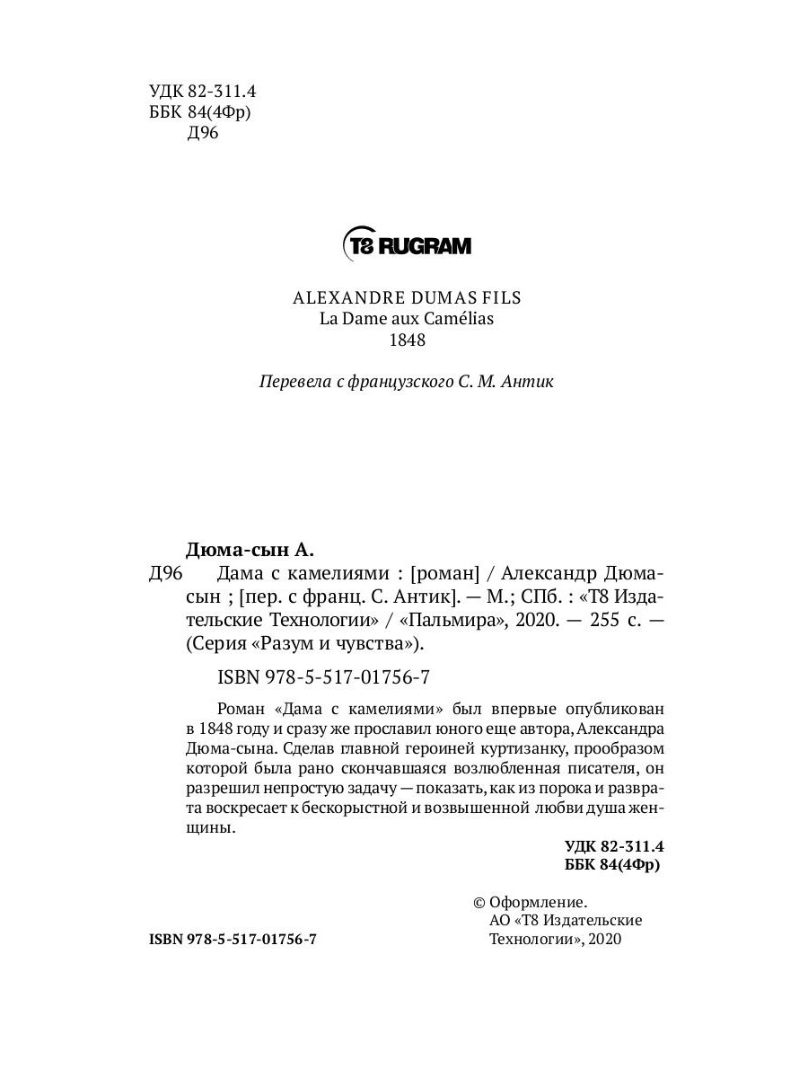 Роман «Дама с камелиями» был впервые опубликован в 1848 году и сразу же прославил юного еще автора, Александра Дюма-сына. Сделав главной героиней куртизанку, прообразом которой была рано скончавшаяся возлюбленная писателя, он разрешил непростую задачу - показать, как из порока и разврата воскресает к бескорыстной и возвышенной любви душа женщины.