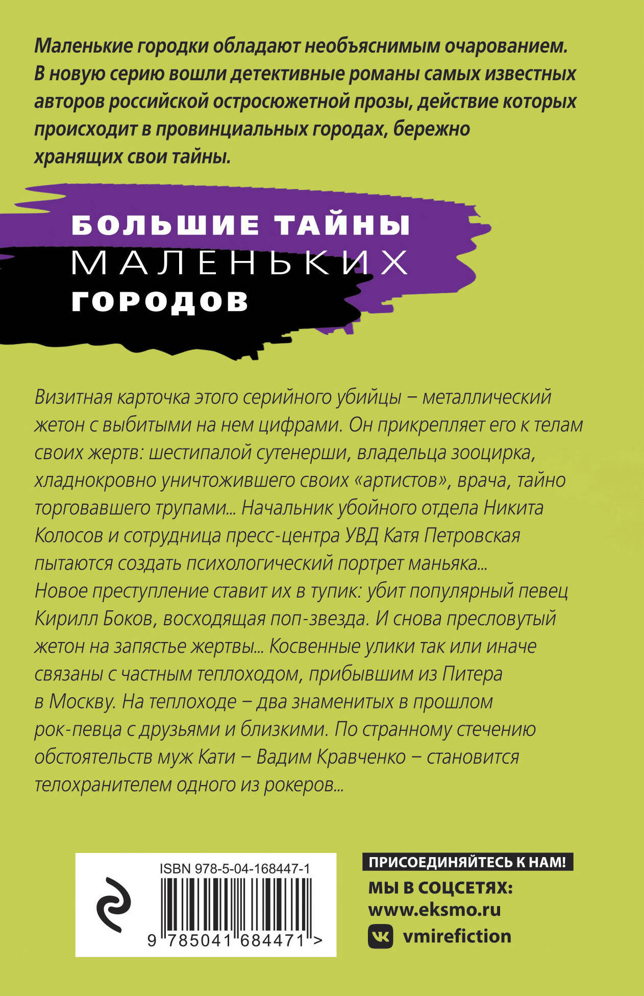 Визитная карточка этого серийного убийцы - металлический жетон с выбитыми на нем цифрами. Он прикрепляет его к телам своих жертв: шестипалой сутенерши, владельца зооцирка, хладнокровно уничтожившего своих «артистов», врача, тайно торговавшего трупами… Начальник убойного отдела Никита Колосов и сотрудница Пресс-центра УВД Катя Петровская пытаются создать психологический портрет маньяка… Новое преступление ставит их в тупик: убит популярный певец Кирилл Боков, восходящая поп-звезда. И снова пресловутый жетон на запястье жертвы… Косвенные улики так или иначе связаны с частным теплоходом, прибывшим из Питера в Москву. На теплоходе - два знаменитых в прошлом рок-певца с друзьями и близкими. По странному стечению обстоятельств муж Кати - Вадим Кравченко - становится телохранителем одного из рокеров… Романы потомственного следователя Татьяны Степановой позволяют читателю побывать в литературной «комнате страха». Таинственные убийства, почти осязаемая атмосфера преступления, томительное и тревожное ожидание чего-то неведомого, пугающего... Все это Татьяне Степановой удается воспроизвести просто блестяще. Случайные встречи, повседневные дела, незначительные детали изображаются в ее детективах в каком-то особом, драматическом свете, словно безобидный весенний луг перед стремительно надвигающейся грозой.| Издательство | Эксмо |