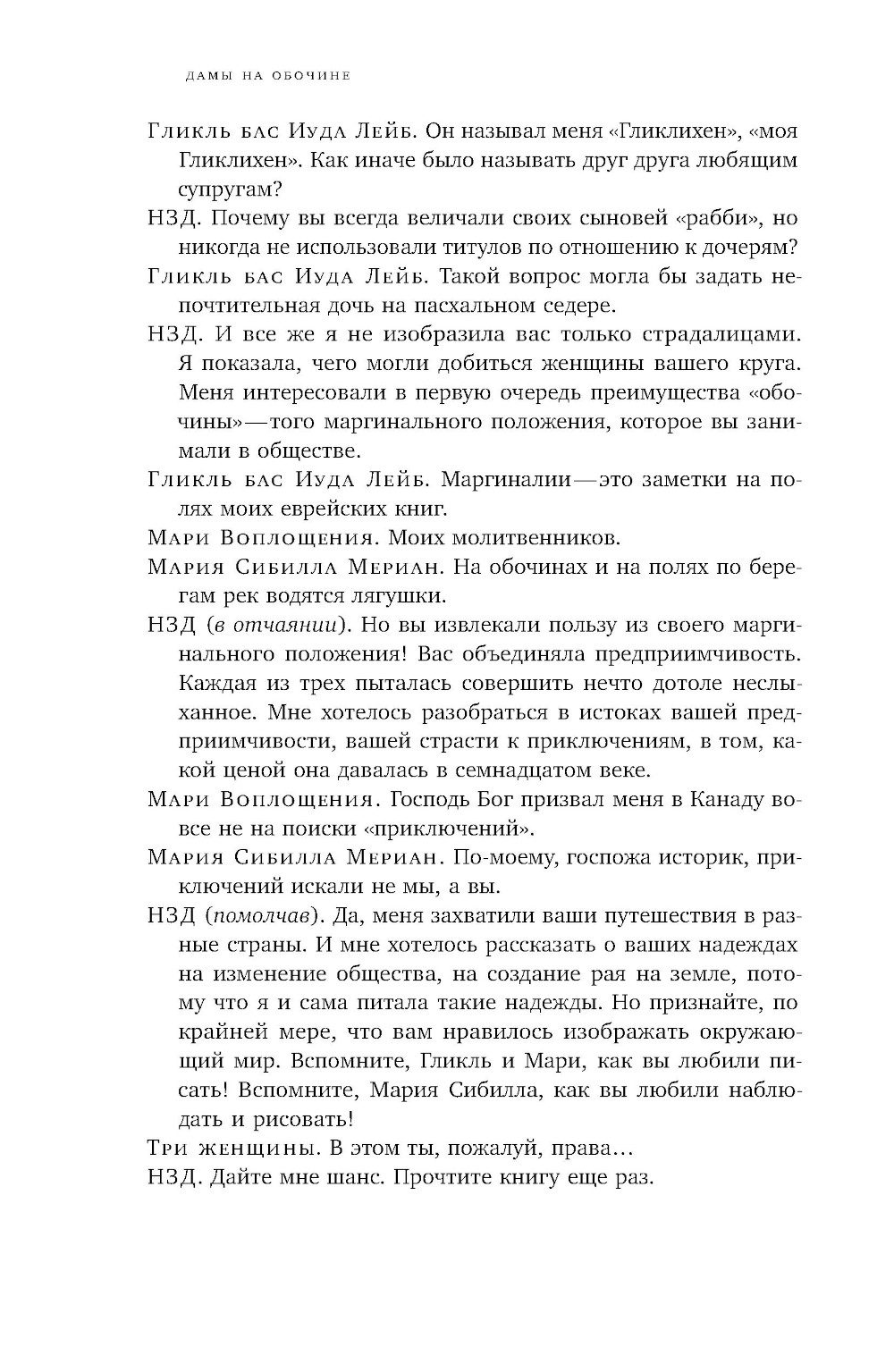 Натали Земон Дэвис - известный историк, почетный профессор Принстонского университета, автор многочисленных трудов по культуре Нового времени. Ее знаменитая книга «Дамы на обочине» (1995) выводит на авансцену трех европейских женщин XVII века, очень разных по жизненному и интеллектуальному опыту, но схожих в своей незаурядности, решительности и независимости. Ни иудейка Гликль бас Иуда Лейб, ни католичка Мари Гюйар дель Энкарнасьон, ни протестантка Мария Сибилла Мериан не были королевскими или знатными особами. Скорее, они жили «на обочине» европейского XVII века, однако их дневники, письма и путевые заметки, утверждает Н. Дэвис, дают нам куда более верное представление о раннем модерном времени, нежели официальная придворная история. Автор тщательно реконструирует жизненные и творческие стратегии этих женщин: как в силу разных культурных традиций каждой пришлось искать свой ответ на вызовы эпохи (замужество, материнство, религия, статус женщины в обществе). Эта монография-триптих описывает полный спектр возможностей женской самореализации в XVII столетии, достичь которой можно было лишь вдали от властных центров, на периферии европейской ойкумены.