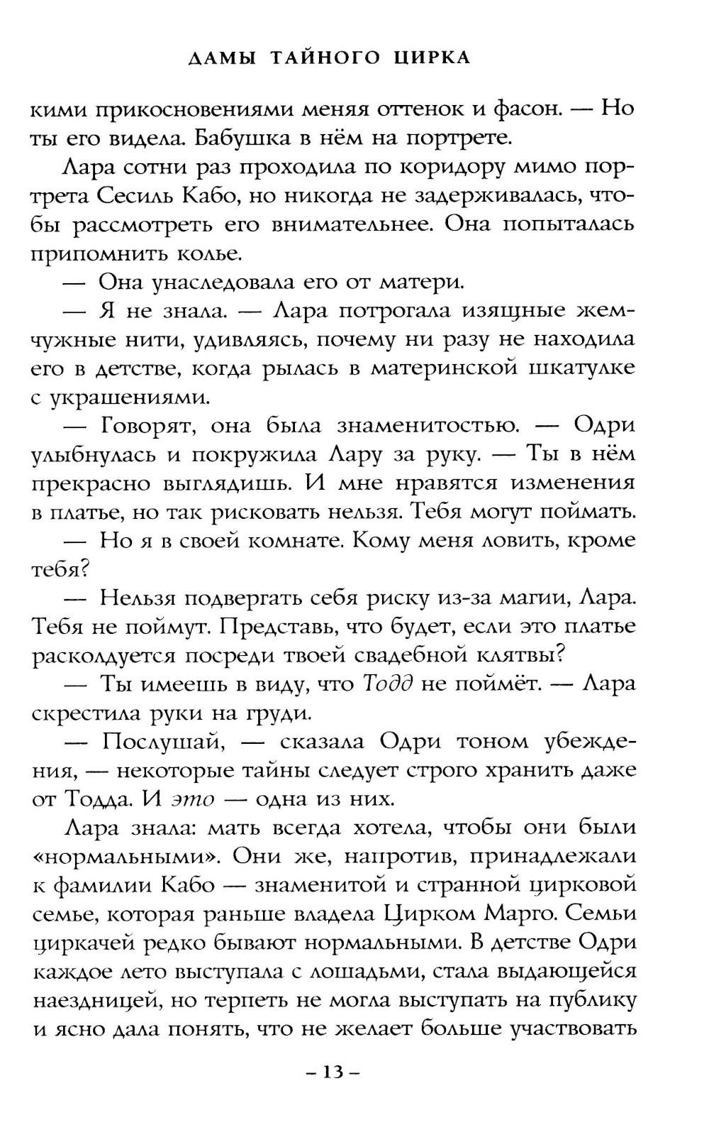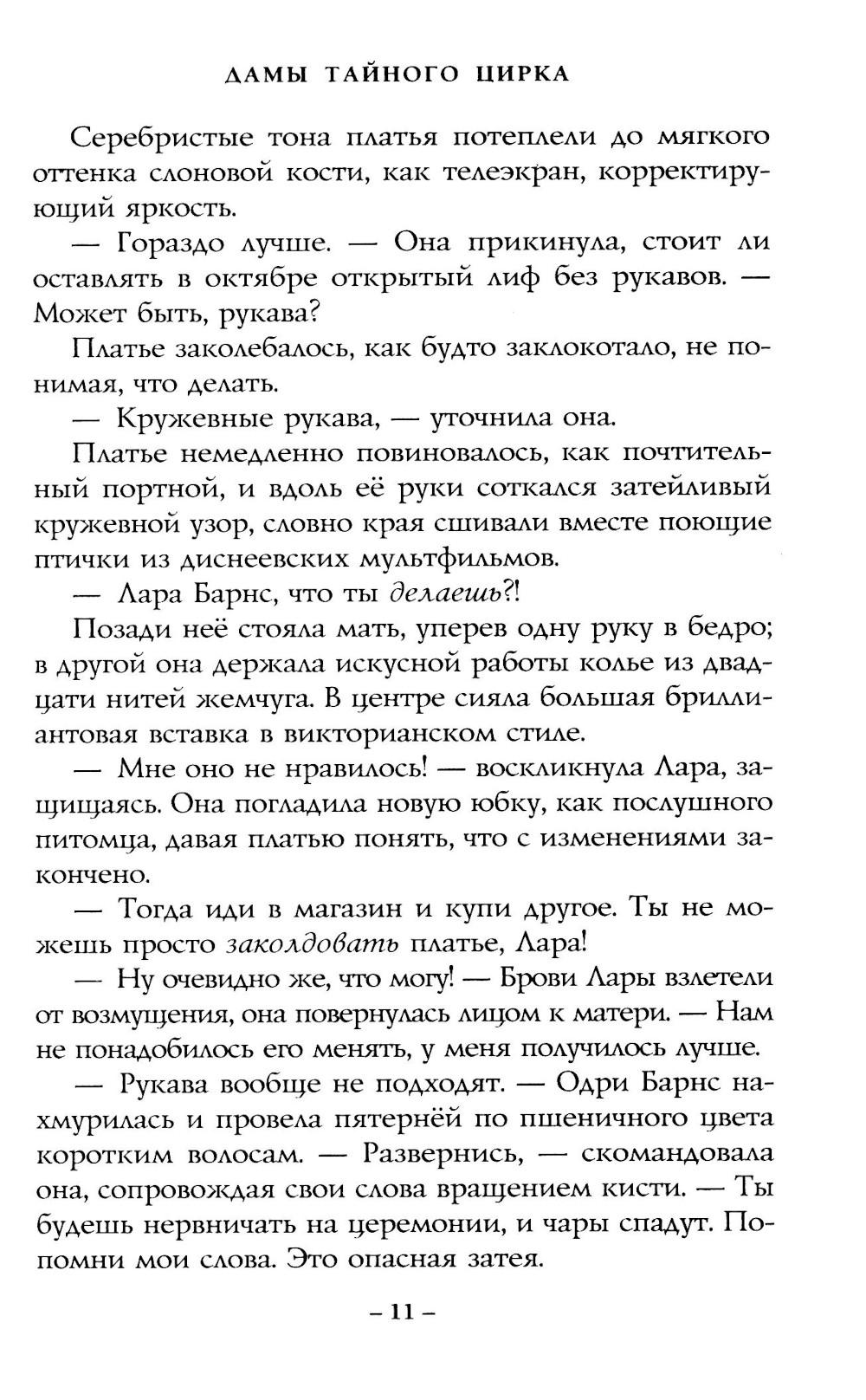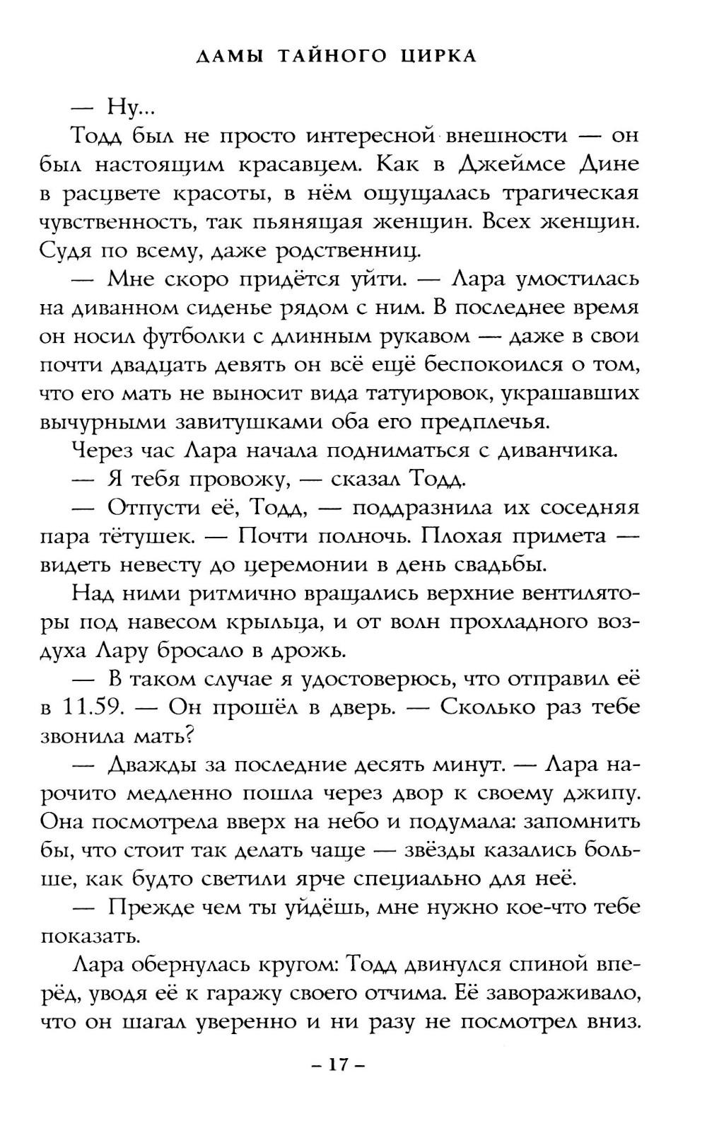 Франция, 1925 год. Сесиль Кабо прикована узами крови к Тайному Цирку: миру чудес, где артисты плетут чары иллюзий, карусели возвращают в прошлое, а воздушные гимнасты умеют летать. Это единственный мир, который известен Сесиль... пока девушка не встречает молодого художника, страсть к которому может разрушить всё. Вирджиния, 2004 год. Лара Барнс уверена, что вскоре станет счастливой женой, но Тодд, её возлюбленный, исчезает в день свадьбы. Отчаянные поиски заставляют девушку искать ответы в дневниках её прабабушки. Так Лара узнаёт историю Тайного Цирка - и фамильные секреты. Ведь на женщинах её рода лежит проклятие, и исчезновение Тодда может быть связано с ним...| Издательство | Эксмо |