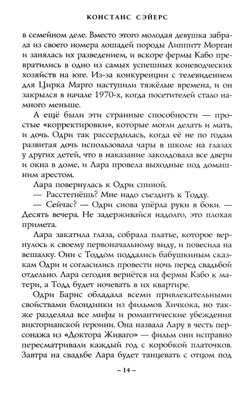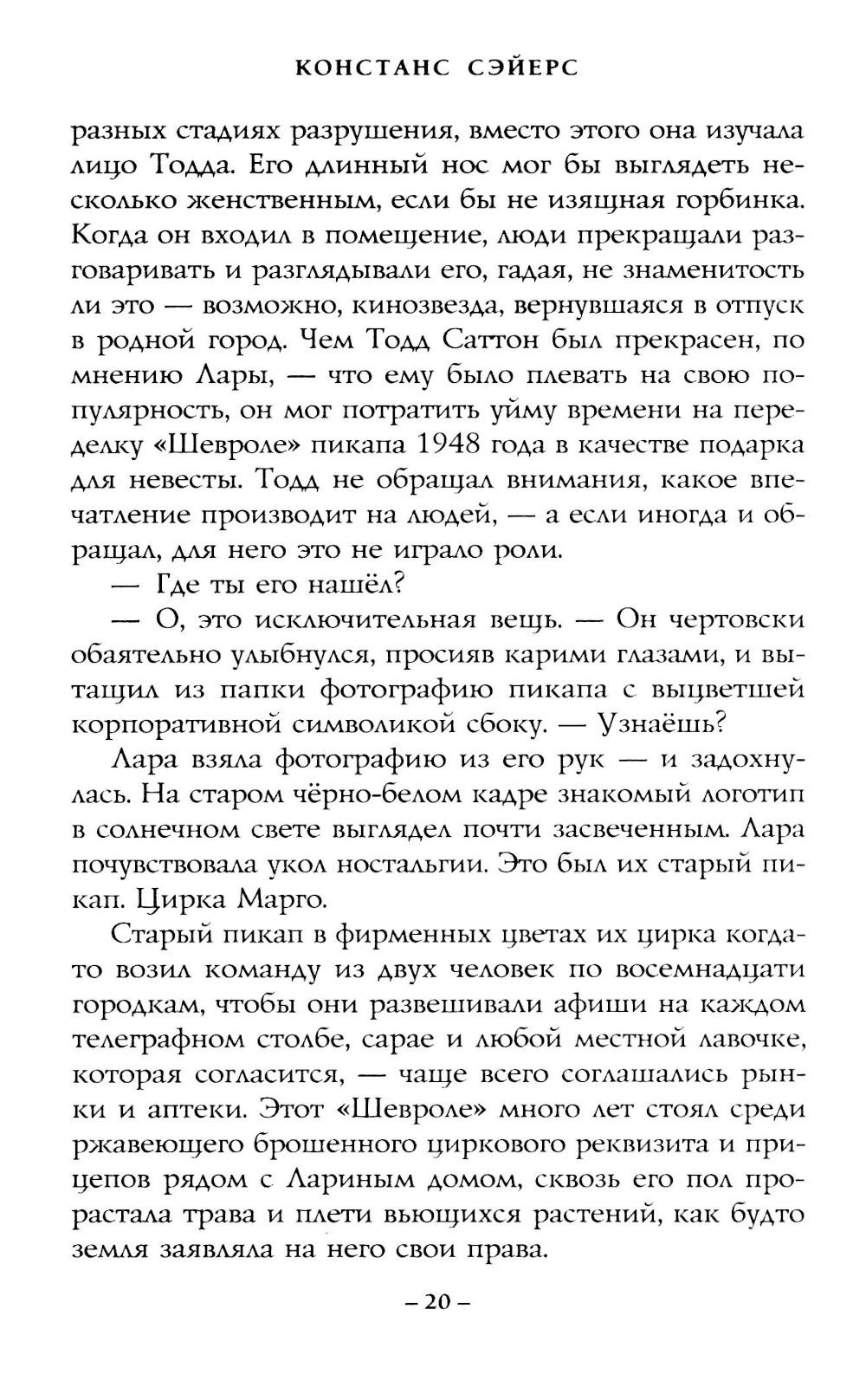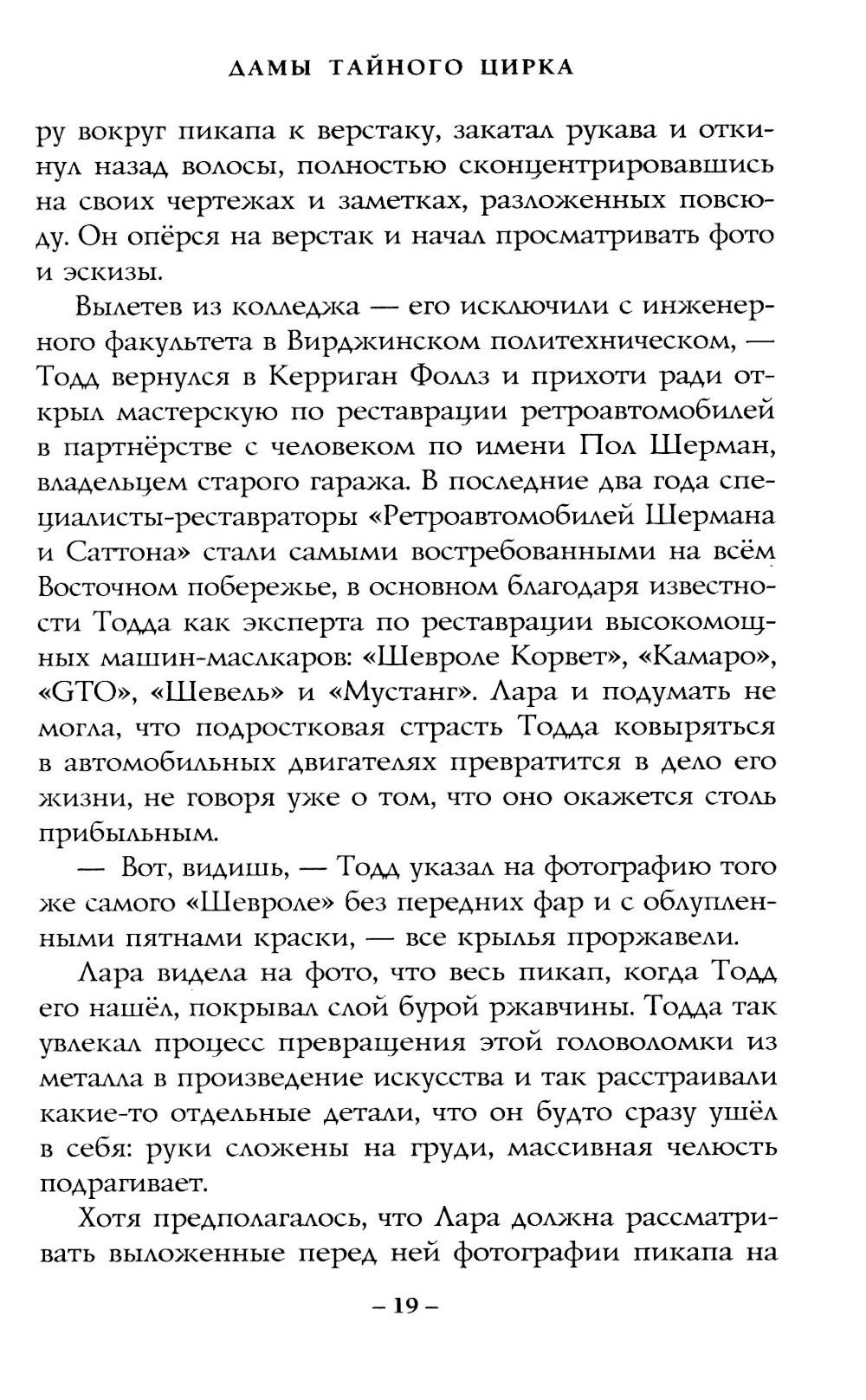 Франция, 1925 год. Сесиль Кабо прикована узами крови к Тайному Цирку: миру чудес, где артисты плетут чары иллюзий, карусели возвращают в прошлое, а воздушные гимнасты умеют летать. Это единственный мир, который известен Сесиль... пока девушка не встречает молодого художника, страсть к которому может разрушить всё. Вирджиния, 2004 год. Лара Барнс уверена, что вскоре станет счастливой женой, но Тодд, её возлюбленный, исчезает в день свадьбы. Отчаянные поиски заставляют девушку искать ответы в дневниках её прабабушки. Так Лара узнаёт историю Тайного Цирка - и фамильные секреты. Ведь на женщинах её рода лежит проклятие, и исчезновение Тодда может быть связано с ним...| Издательство | Эксмо |