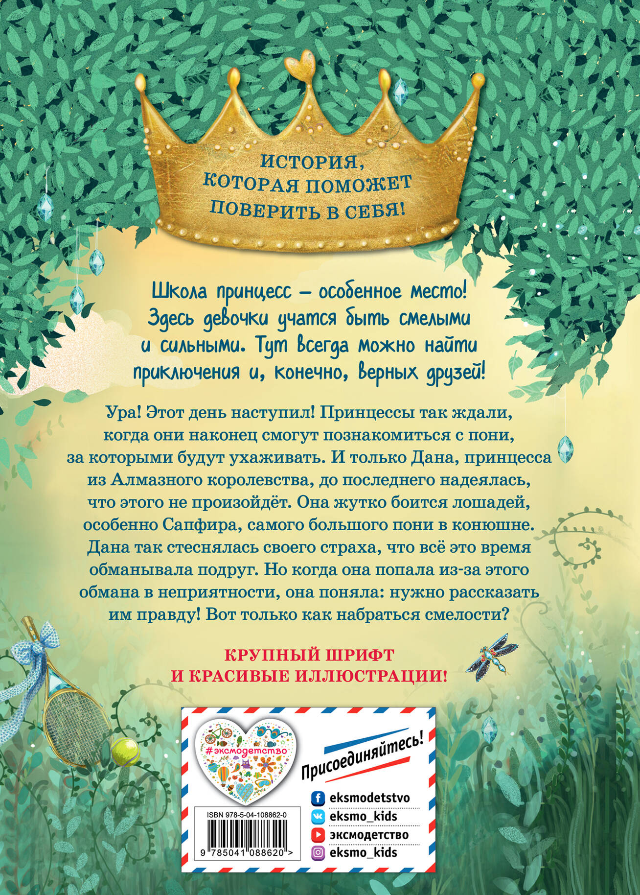 В Школе принцесс проходит много интересных и необычных занятий. Например, каждой из учениц должен достаться пони, за которым она будет ухаживать. Все девочки с нетерпением ждут, когда же они познакомятся со своими лошадками. Все, кроме Даны. Принцесса из Алмазного королевства жутко боится этих животных! Особенно Сапфира, самого большого пони. Вот только как рассказать об этом другим девочкам? Что, если они будут над ней смеяться? Уж лучше соврать, что ей тоже нравятся пони! Но когда Дана попадает из-за своего обмана в неприятности, она решает рассказать подругам правду. Вот только как набраться смелости? ИСТОРИЯ, КОТОРАЯ ПОМОЖЕТ ПОВЕРИТЬ В СЕБЯ! КРУПНЫЙ ШРИФТ И КРАСИВЫЕ ИЛЛЮСТРАЦИИ!