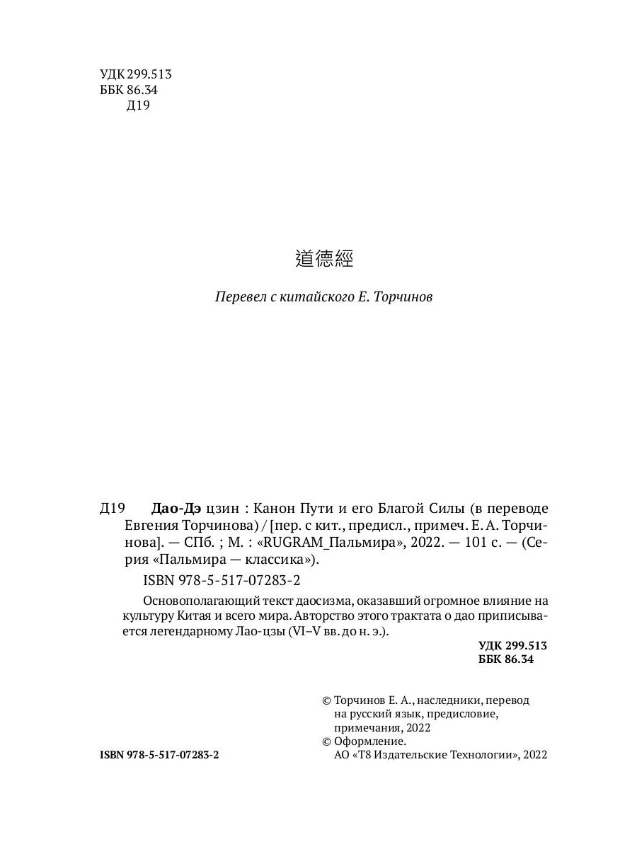 Основополагающий текст даосизма, оказавший огромное влияние на культуру Китая и всего мира. Авторство этого трактата о дао приписывается легендарному Лао-цзы (VI - V вв. до н. э. )