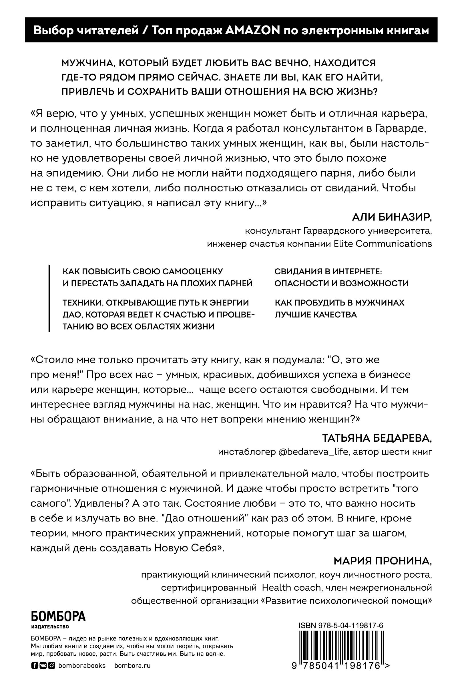 Мужчина, который будет любить вас вечно, находится где-то рядом прямо сейчас. Знаете ли вы, как его найти, привлечь и сохранить ваши отношения на всю жизнь? ОТ АВТОРА «Я верю, что у умных, успешных женщин может быть и отличная карьера, и полноценная личная жизнь. Когда я работал консультантом в Гарварде, то заметил, что большинство таких умных женщин, как вы, были настолько не удовлетворены своей личной жизнью, что это было похоже на эпидемию. Они либо не могли найти подходящего парня, либо были не с тем, с кем хотели, либо полностью отказались от свиданий. Чтобы исправить ситуацию, я, написал эту книгу… Будучи пожизненным членом тайного общества под названием «Мужчины», я отлично понимаю, как они мыслят. А знание философии Дао, которая позволяет находиться в потоке - помогла мне создать методику, которая точно поможет вам стать самой лучшей и самой счастливой». Али Биназир, консультант Гарвардского университета, инженер счастья компании Elite Communications. О КНИГЕ - Как повысить свою самооценку и перестать западать на плохих парней - Свидания в интернете: опасности и возможности - Как пробудить в мужчинах лучшие качества - Физическая привлекательность и искусство искушения - 15 упражнений для вашей полной неотразимости - Техники, открывающие путь к энергии Дао, которая ведет к счастью и процветанию во всех областях жизни "Быть образованной, обаятельной и привлекательной мало, чтобы построить гармоничные отношения с мужчиной. И даже чтобы просто встретить «того самого». Удивлены? А это так. Состояние любви - это то, что важно носить в себе и излучать во вне. Книга «Дао любви» как раз об этом. В книге кроме теории, много практических упражнений, которые помогут шаг за шагом, каждый день создавать Новую Себя". Мария Пронина - практикующий клинический психолог, коуч личностного роста, сертифицированный Health coach, член межрегиональной общественной организации «Развитие психологической помощи»| Издательство | Эксмо |