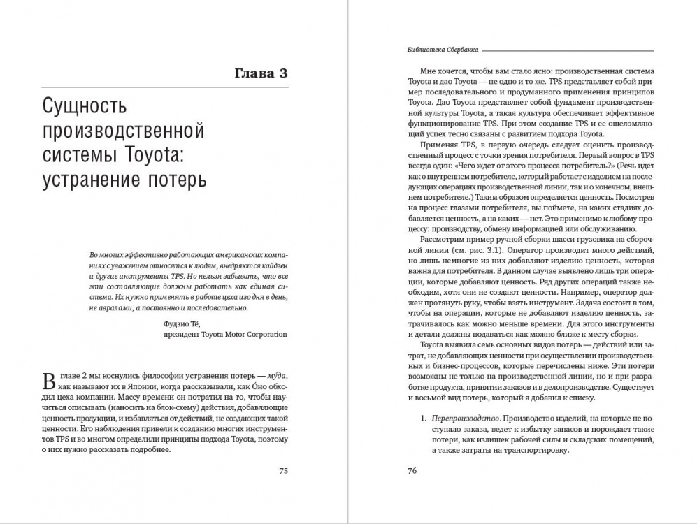 «Оптимальное сочетание философии, процесса, человеческих ресурсов и решения проблем создает обучающуюся структуру. Я убежден, что любая компания, занимается производством или предоставлением услуг, должна стать обучающейся структурой, если она хочет преуспеть в долгосрочной перспективе. Toyota - блестящий пример такого предприятия».