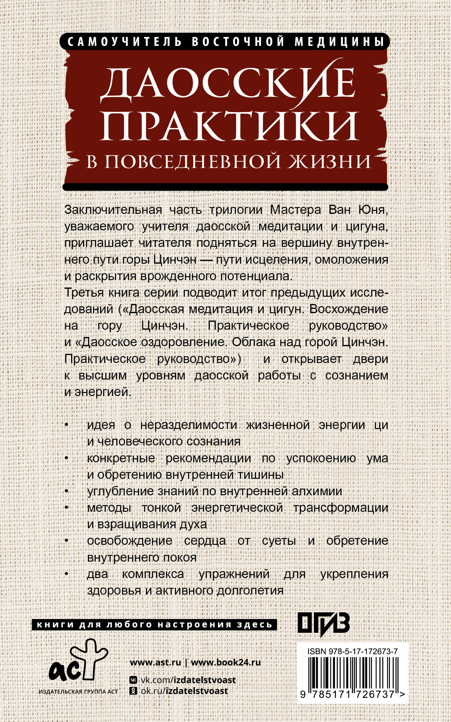 Заключительная часть трилогии Мастера Ван Юня, уважаемого учителя даосской медитации и цигуна, приглашает читателя подняться на вершину внутреннего пути горы Цинчэн - пути исцеления, омоложения и раскрытия врожденного потенциала. Третья книга серии подводит итог предыдущих исследований ("Даосская медитация и цигун. Восхождение на гору Цинчэн. Практическое руководство" и "Даосское оздоровление. Облака над горой Цинчэн. Практическое руководство") и открывает двери к высшим уровням даосской работы с сознанием и энергией. • идея о неразделимости жизненной энергии ци и человеческого сознания • конкретные рекомендации по успокоению ума и обретению внутренней тишины • углубление знаний по внутренней алхимии • методы тонкой энергетической трансформации и взращивания духа • освобождение сердца от суеты и обретение внутреннего покоя • два комплекса упражнений для укрепления здоровья и активного долголетия| Издательство | Издательство "АСТ" |