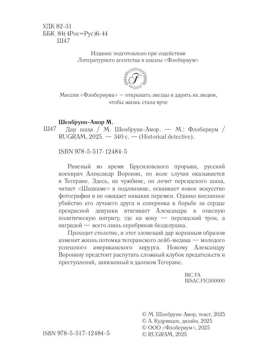 Раненый во время Брусиловского прорыва, русский военврач Александр Воронин, по воле случая оказывается в Тегеране. Здесь, на чужбине, он лечит персидского шаха, читает «Шахнаме» в подлиннике, осваивает новое искусство фотографии и не ожидает никаких перемен. Однако внезапное убийство его лучшего друга и соперника в борьбе за сердце прекрасной девушки втягивает Александра в опасную политическую интригу, где на кону - персидский трон, а наградой - всего лишь серебряная безделушка. Проходит столетие, и этот зловещий дар коренным образом изменит жизнь потомка тегеранского лейб-медика - молодого успешного американского хирурга. Новому Александру Воронину предстоит распутать сложный клубок предательств и преступлений, завязанный в далеком Тегеране.| Издательство | Т8 RUGRAM |