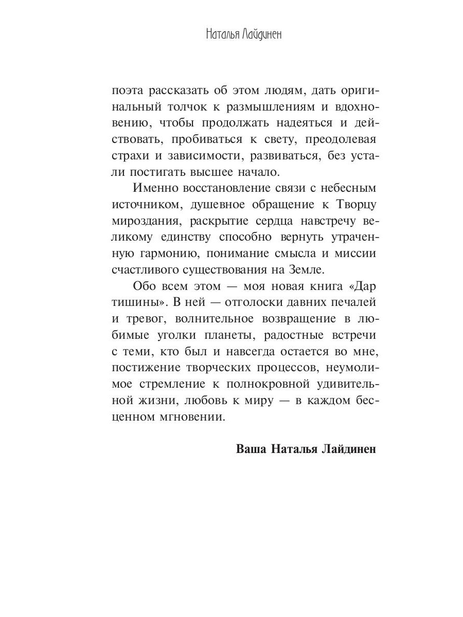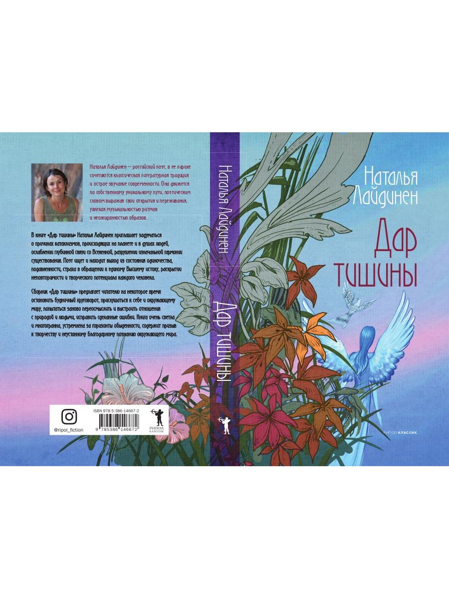 В книге «Дар тишины» Наталья Лайдинен приглашает задуматься о причинах катаклизмов, происходящих на планете и в душах людей, ослаблении глубинной связи со Вселенной, разрушении изначальной гармонии существования. Поэт ищет и находит выход из состояния одиночества, подавленности, страха в обращении к единому Высшему истоку, раскрытии неповторимости и творческого потенциала каждого человека. Сборник «Дар тишины» предлагает читателю на некоторое время остановить будничный круговорот, прислушаться к себе и окружающему миру, попытаться заново переосмыслить и выстроить отношения с природой и людьми, исправить сделанные ошибки. Книга очень светла и многогранна, устремлена за горизонты обыденности, содержит призыв к творчеству и неустанному благодарному познанию окружающего мира.| Издательство | Рипол Классик |