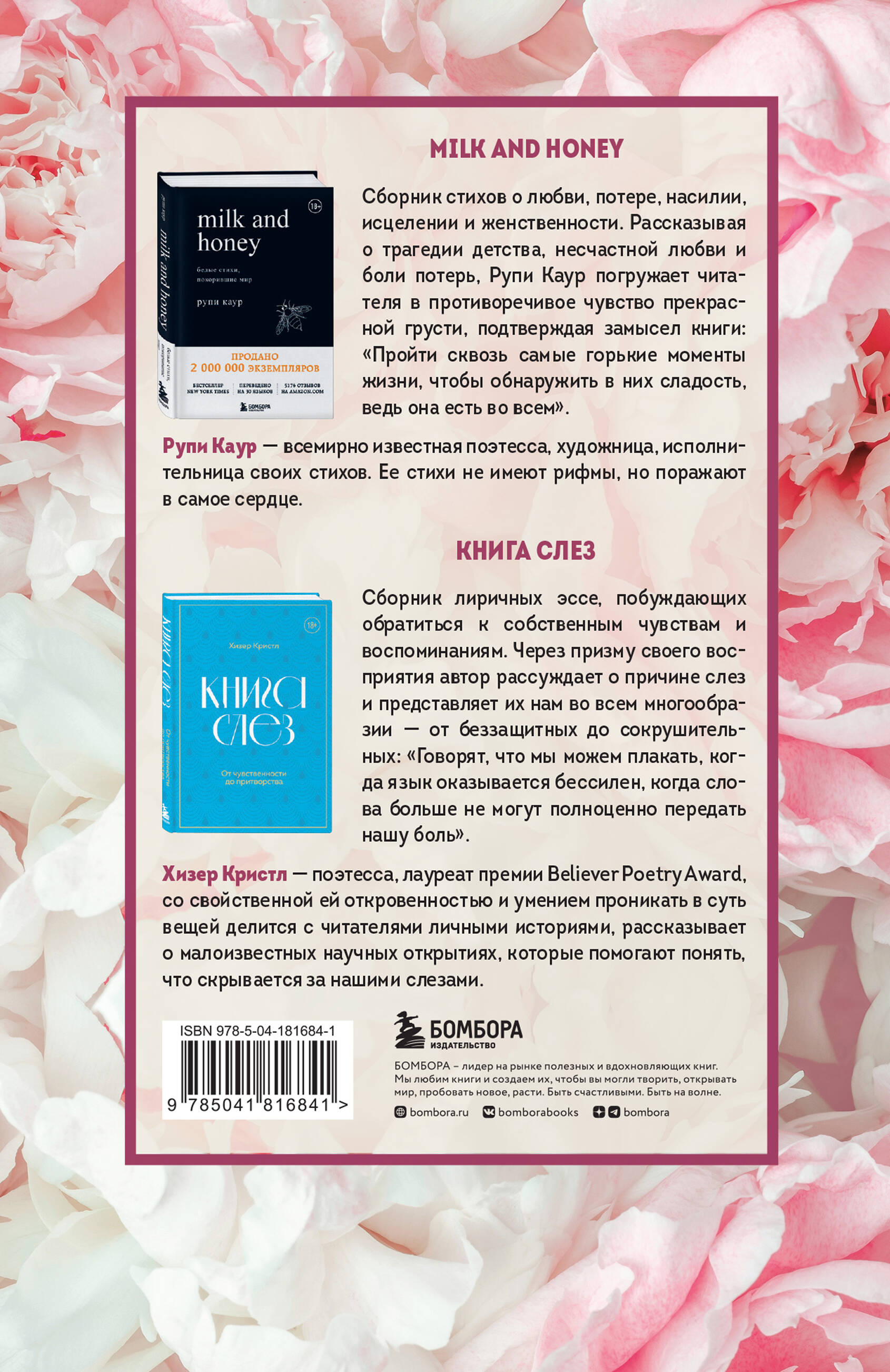 Комплект из двух книг. «MILK AND HONEY» Сборник стихов о любви, потере, насилии, исцелении и женственности. Рассказывая о трагедии детства, несчастной любви и боли потерь, Рупи Каур погружает читателя в противоречивое чувство прекрасной грусти, подтверждая замысел книги: «Пройти сквозь самые горькие моменты жизни, чтобы обнаружить в них сладость, ведь она есть во всем». Рупи Каур - всемирно известная поэтесса, художница, исполнительница своих стихов. Ее стихи не имеют рифмы, но поражают в самое сердце. «КНИГА СЛЕЗ» Сборник лиричных эссе, побуждающих обратиться к собственным чувствам и воспоминаниям. Через призму своего восприятия автор рассуждает о причине слез и представляет их нам во всем многообразии - от беззащитных до сокрушительных: «Говорят, что мы можем плакать, когда язык оказывается бессилен, когда слова больше не могут полноценно передать нашу боль». Хизер Кристл, поэтесса, лауреат премии Believer Poetry Award, со свойственной ей откровенностью и умением проникать в суть вещей, делится с читателями личными историями, рассказывает о малоизвестных научных открытиях, которые помогают понять, что скрывается за нашими слезами.| Издательство | ООО "Издательство "Эксмо" |