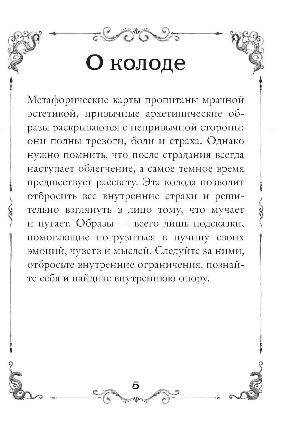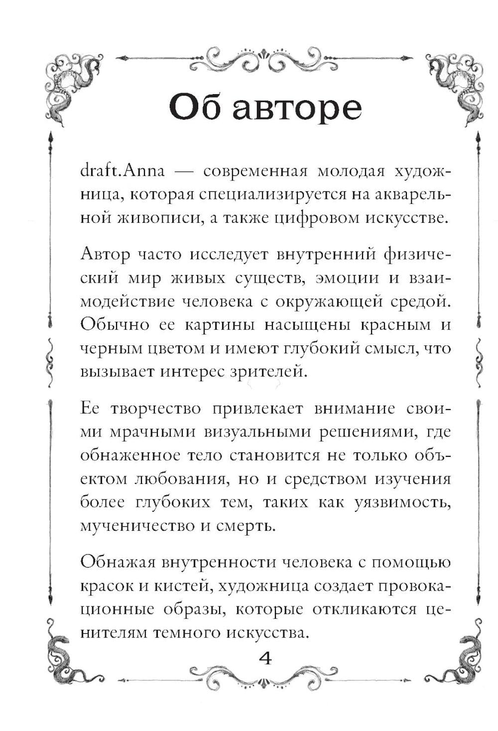 Соединяя мрачность, жестокость и откровенность с нежностью, гармоничностью и красотой, отвращение смешивается с восхищением, и становится невозможно отвести глаза от колоды в ваших руках. Эта авторская колода дает возможность заглянуть в бездну своего «Я» и найти ответы на давно волнующие вопросы, скрытые в самой глубине подсознания. Впрочем, людям, не интересующимся психологией, эта колода также будет интересна: этот проект можно рассматривать как необычный артбук, включающий в себя работы современной художницы draft. Anna, которые не оставят равнодушным ни одного любителя темного искусства. draft. Anna - современная художница и книжный иллюстратор, известная по таким проектам, как артбук DARK ART и серии «Комильфо. Страшные сказки Азии».| Издательство | Эксмо |