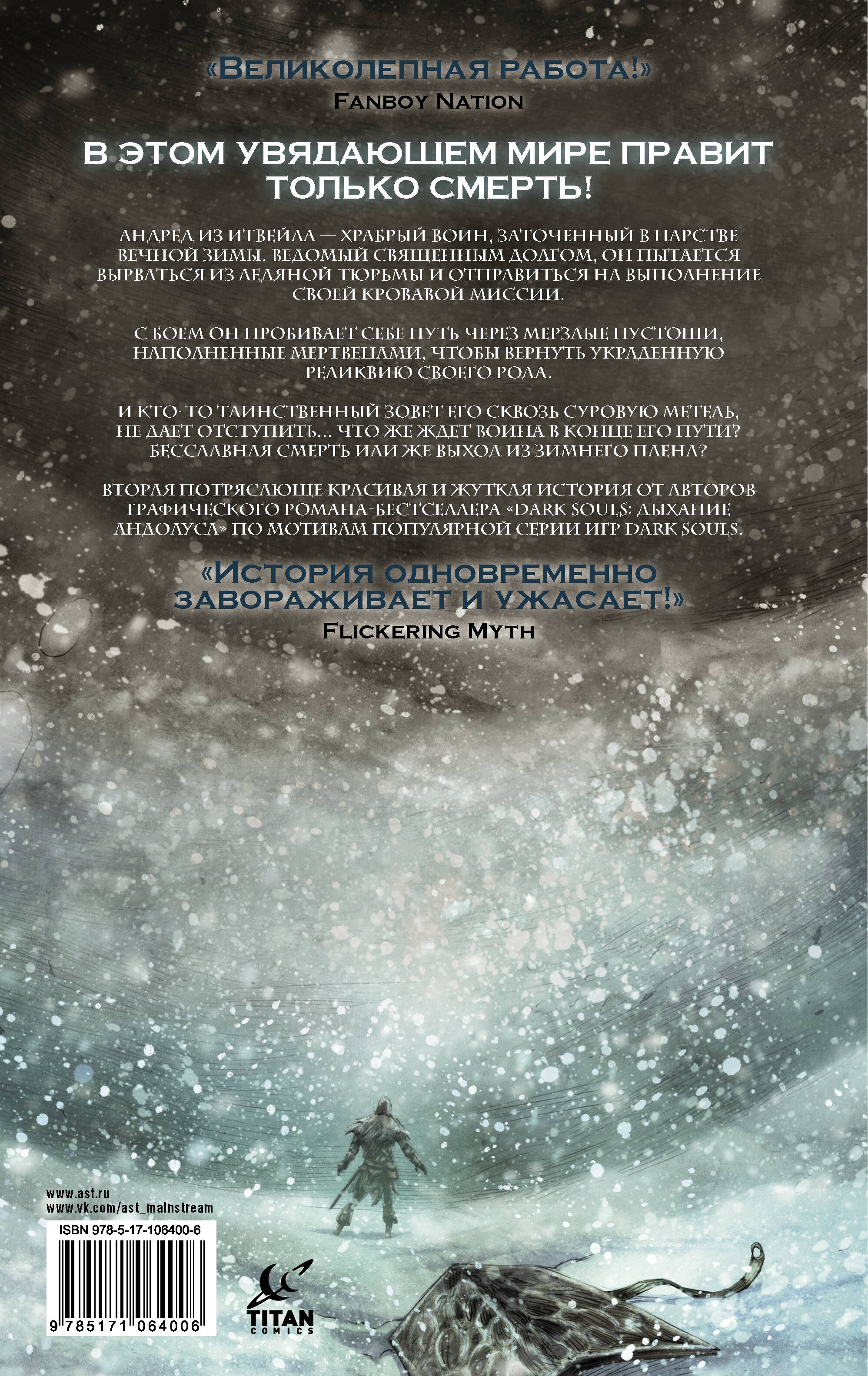 Андред из Итвейла - храбрый воин, заточённый в царстве вечной зимы. Ведомый священным долгом, он пытается вырваться из ледяной тюрьмы, чтобы выполнить свою кровавую миссию. С боем он пробивает себе путь через мёрзлые пустоши, наполненные мертвецами, стараясь вернуть украденную реликвию своего рода. Вторая потрясающе красивая и жуткая история от авторов графического романа-бестселлера "Dark Souls: Дыхание Андолуса" по мотивам популярной серии игр Dark Souls.| Издательство | Издательство "АСТ" |