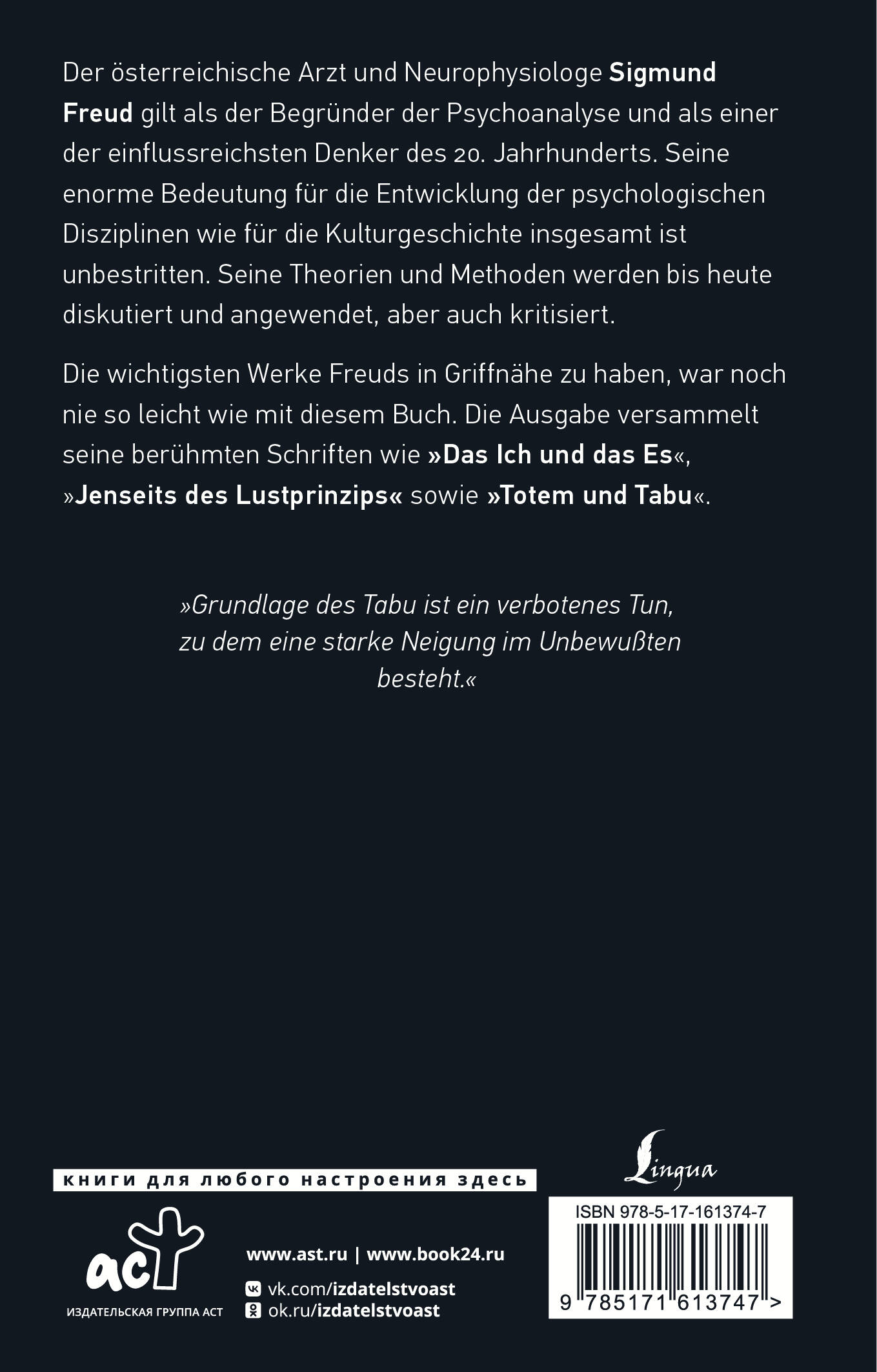 Издание на немецком языке. Зигмунд Фрейд - выдающийся австрийский психолог и психиатр, основатель психоанализа, один из самых влиятельных мыслителей XX века. Его работы сформировали основы современной психологии и внесли значительный вклад в понимание человеческого поведения и психических расстройств. В сборник вошли самые важные и увлекательные работы Фрейда - "Тотем и Табу", "По ту сторону принципа удовольствия", "Я и Оно". В этих произведениях автор затрагивает наиболее спорные и значимые темы психоанализа - связь древних культур с морально-этическими нормами современного общества, психологию сексуальности и глубинные механизмы взаимодействия сознательного и бессознательного. Книга издана в неадаптированной версии. Познайте свое внутреннее "я" и насладитесь духовным миром Фрейда в оригинале!| Издательство | Издательство "АСТ" |